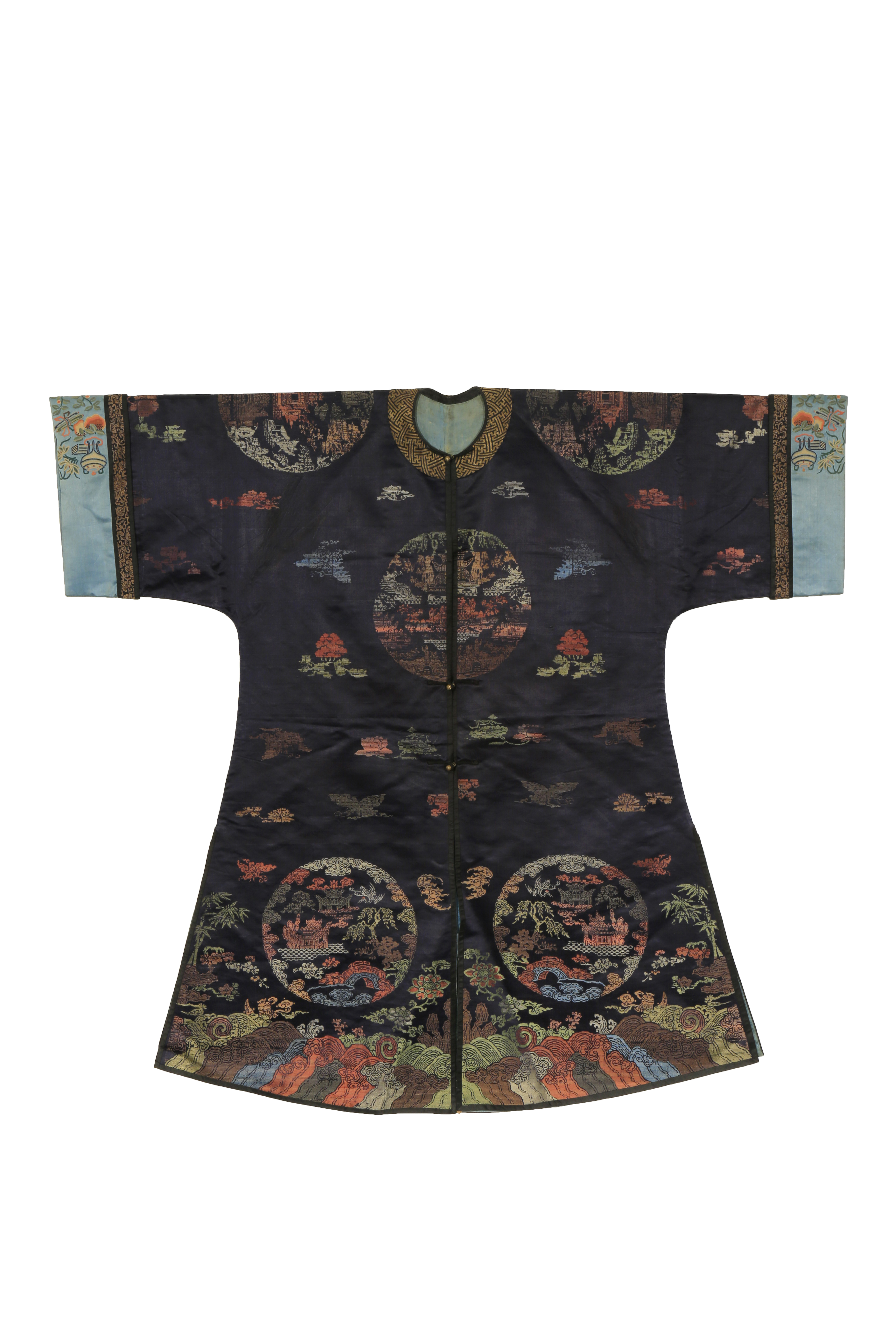 THREE CHINESE EMBROIDERED SILK ROBES AND A FAN LATE QING DYNASTY One robe decorated with dragons...