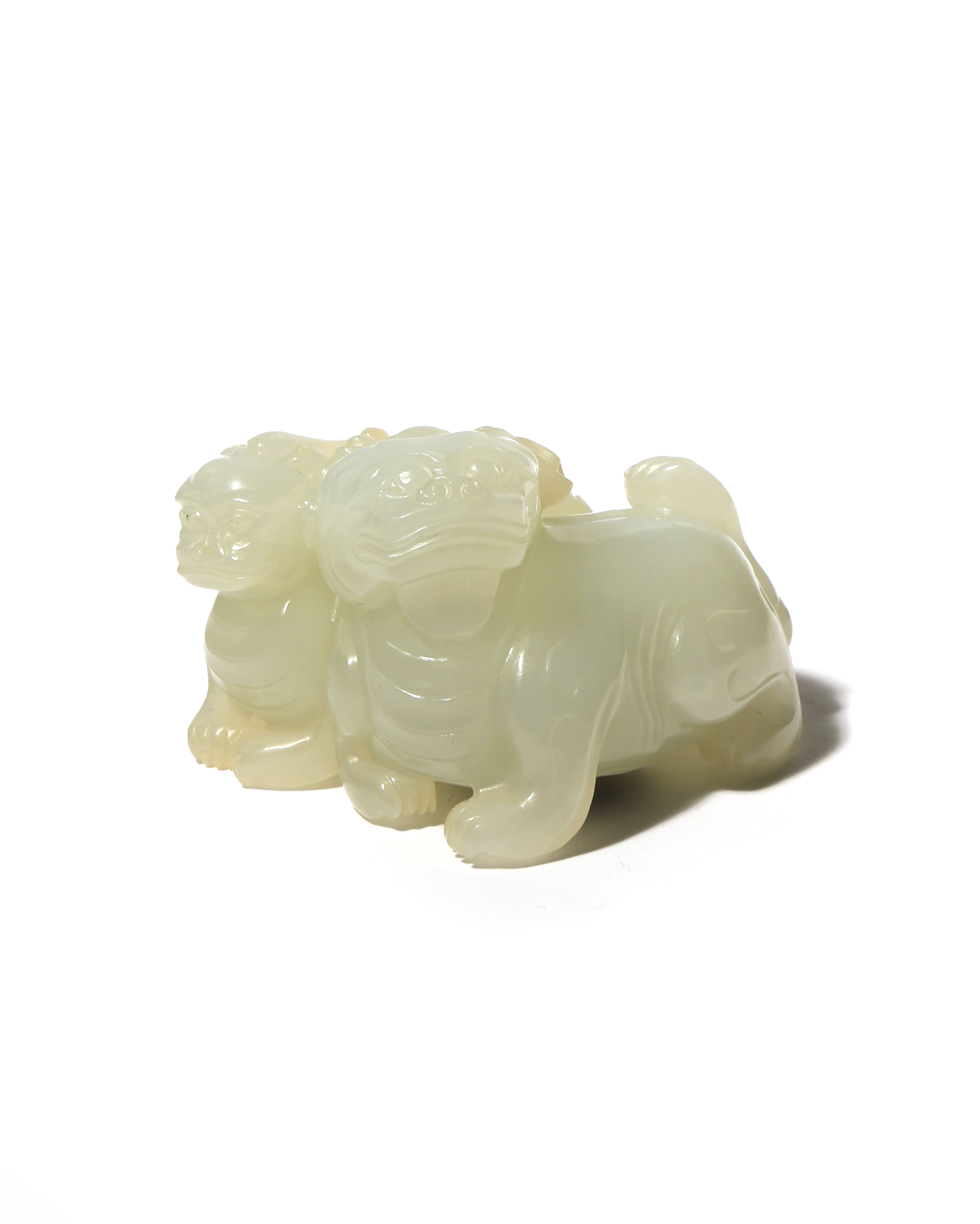A CHINESE PALE CELADON JADE CARVING OF TWO MYTHICAL CREATURES QING DYNASTY OR LATER Worked as a...