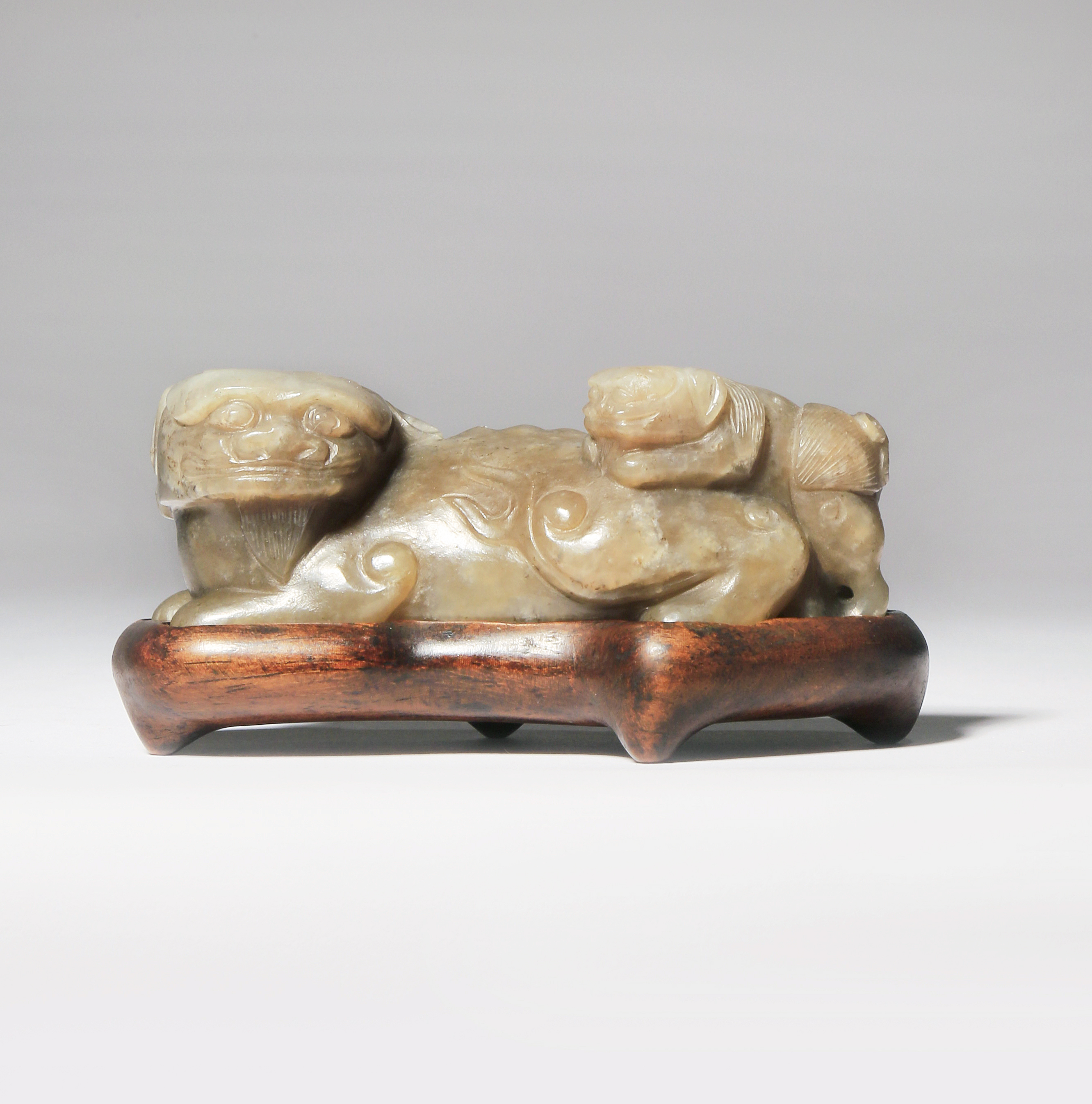 Formed as a recumbent lion dog turning its head to sinister, with its cub clambering over its back, each carved with a bony spine and bulging eyes, with the hairs of their tails, manes and beards finely incised, together with a wood stand, 7.7cm. (2)