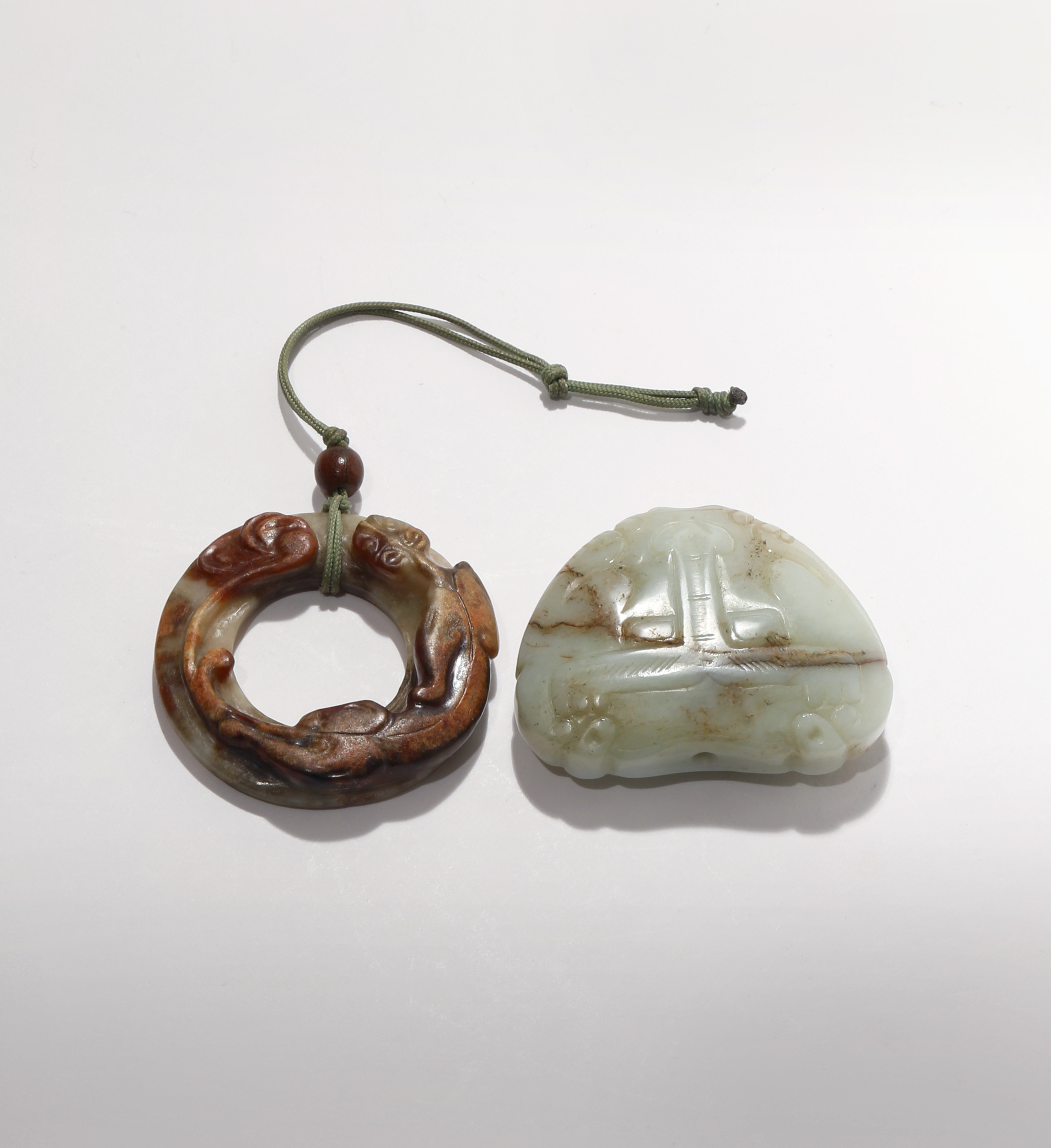 One a heart-shaped bead carved with a stylised taotie mask head, the other a ring carved with a chilong in a brown and celadon stone, 5cm and 5.3cm. (2)