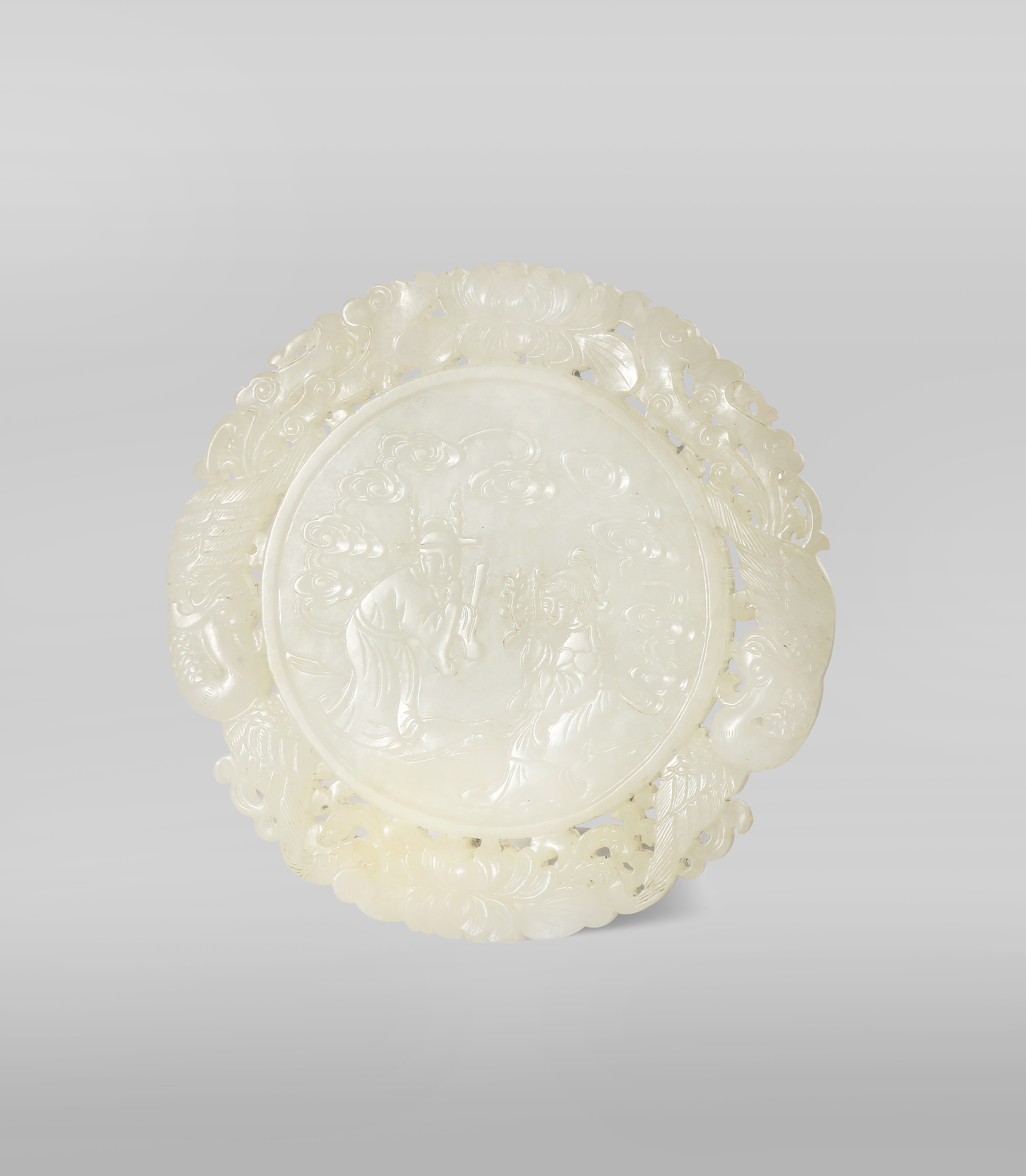 A CHINESE WHITE JADE CIRCULAR PLAQUE QING DYNASTY OR LATER One side carved with two figures...