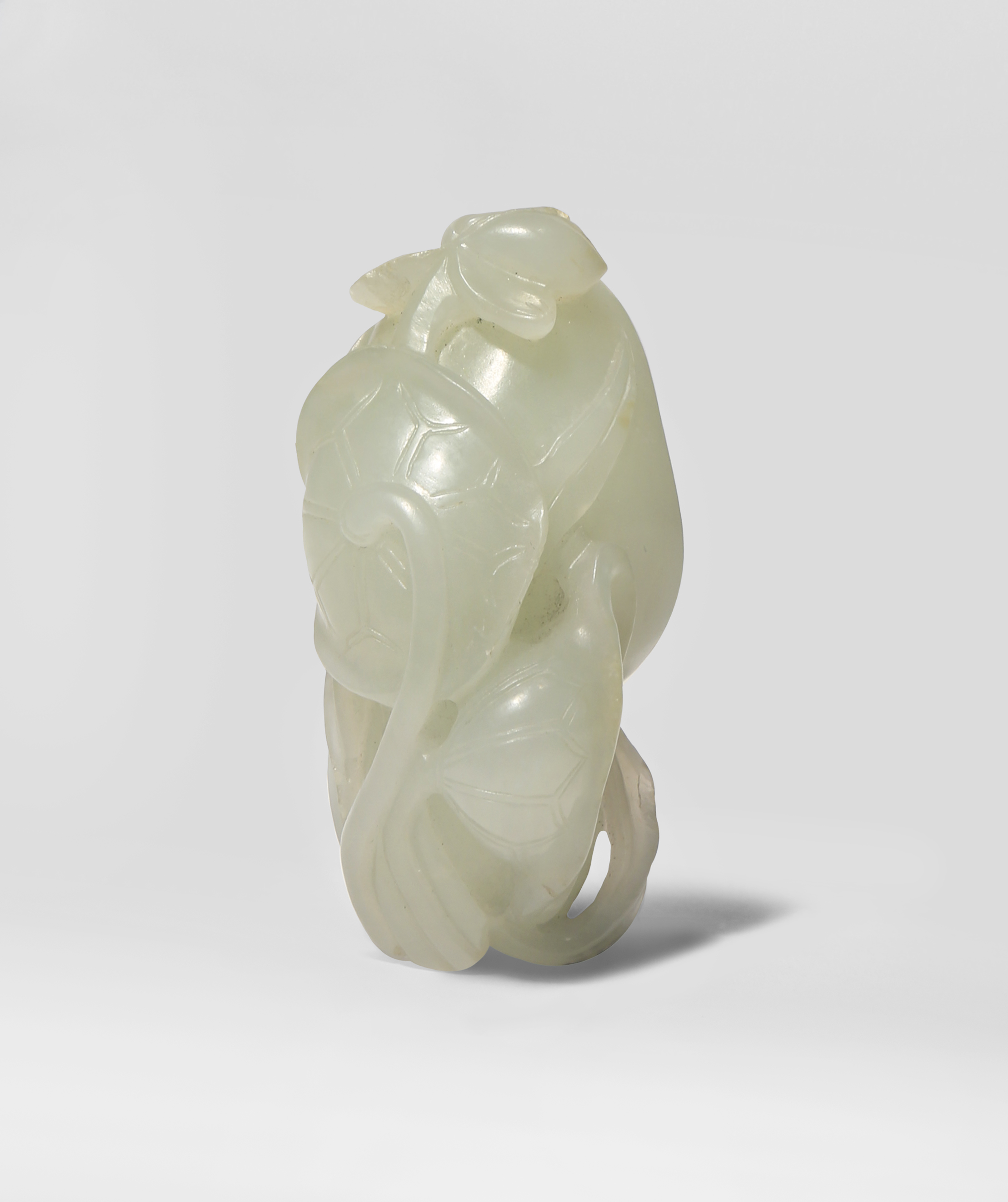 Formed as two large seed pods, with lotus leaves and a single blossom growing underneath from fine trailing stems, the stone of an even tone, 5.3cm.