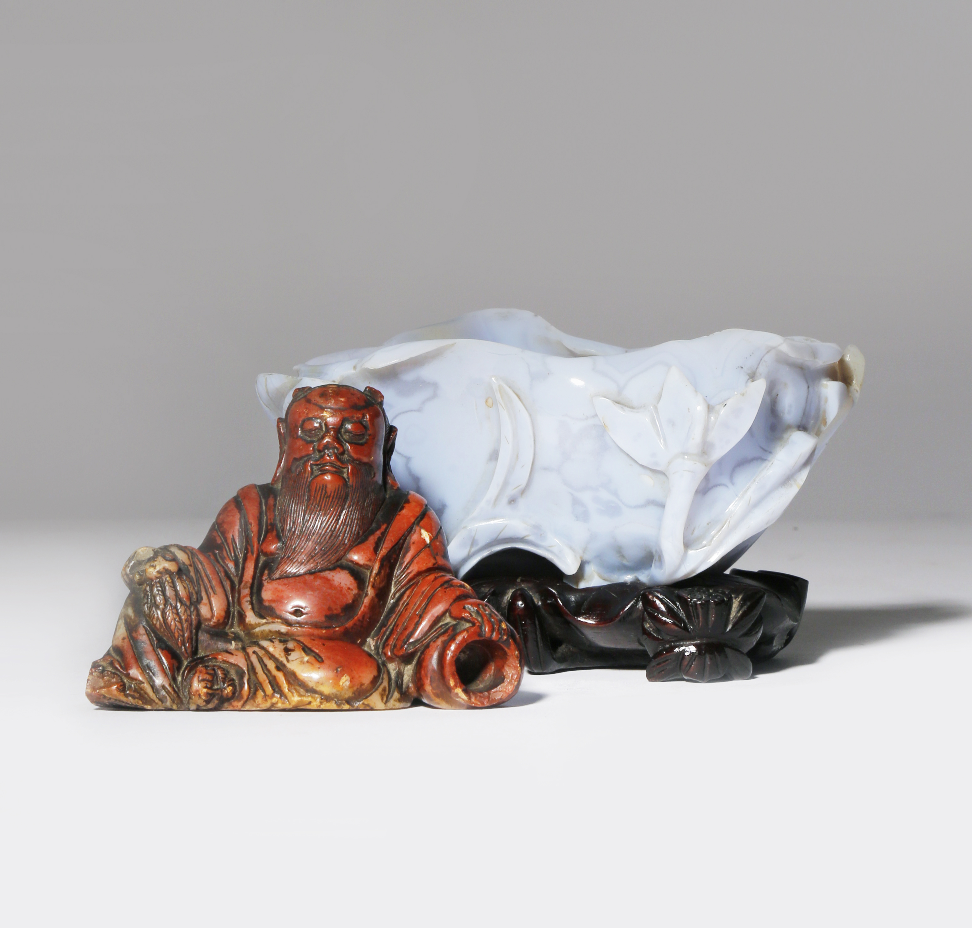 A CHINESE AGATE BRUSH WASHER AND A SOAPSTONE FIGURE OF AN IMMORTAL QING DYNASTY The brushwasher...