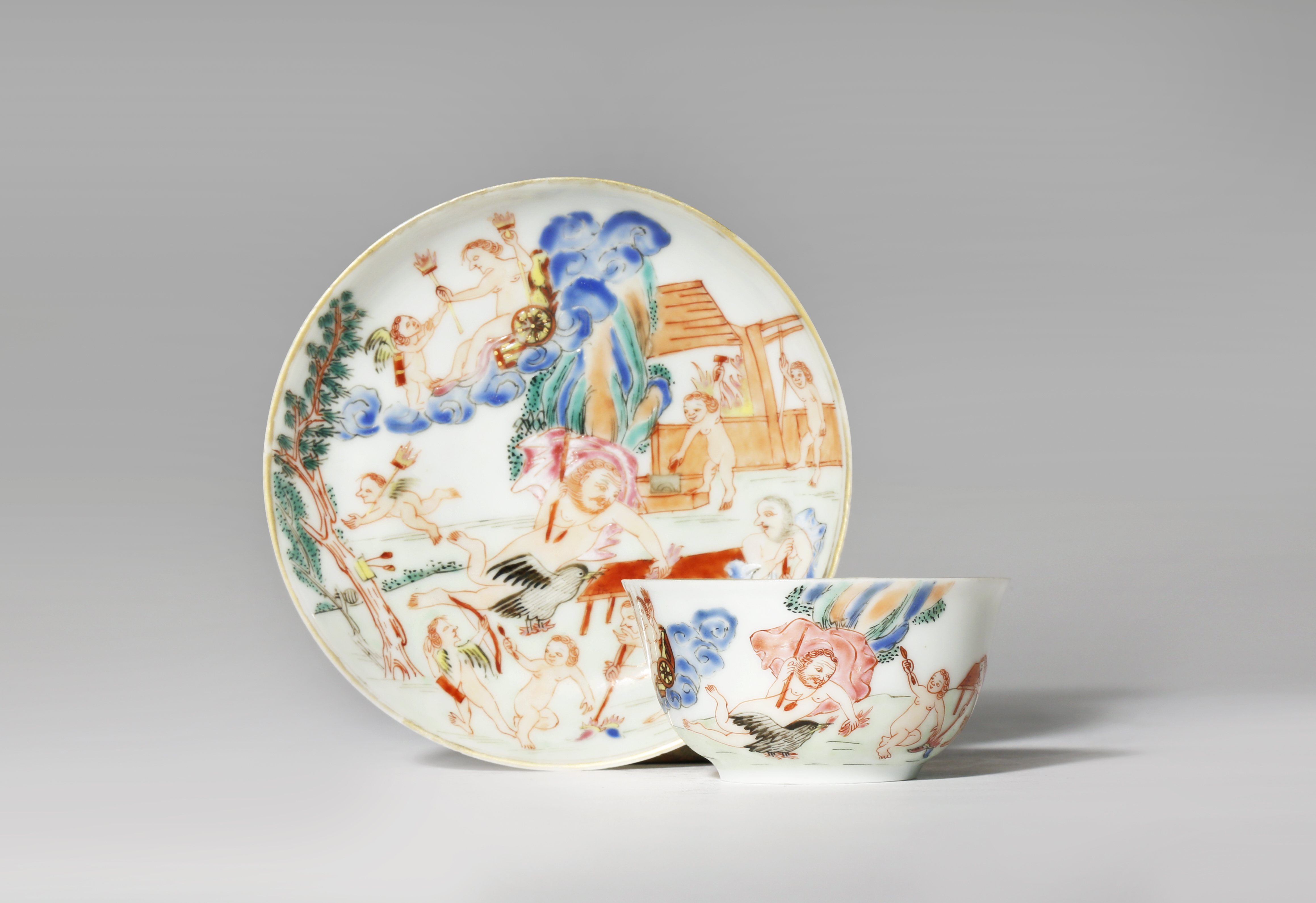 A RARE CHINESE FAMILLE ROSE MYTHOLOGICAL SUBJECT TEA BOWL AND SAUCER C.1740 Painted with an...