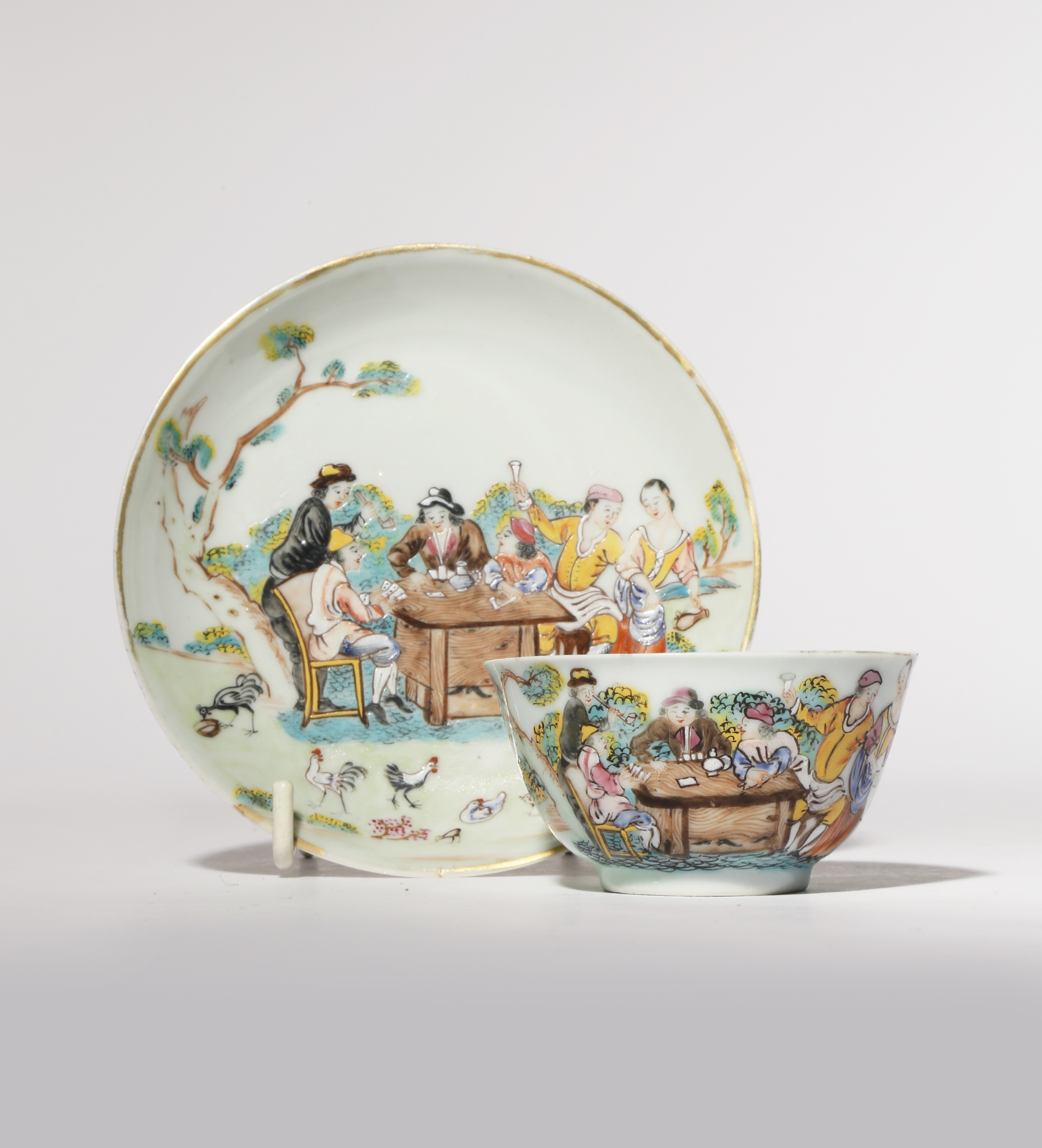 Finely painted with figures drinking and smoking as they play cards at a table in a garden, with chickens around them, with paper labels for Dr Anton C R Dreesmann Collection, no.J116, 12cm. (2)