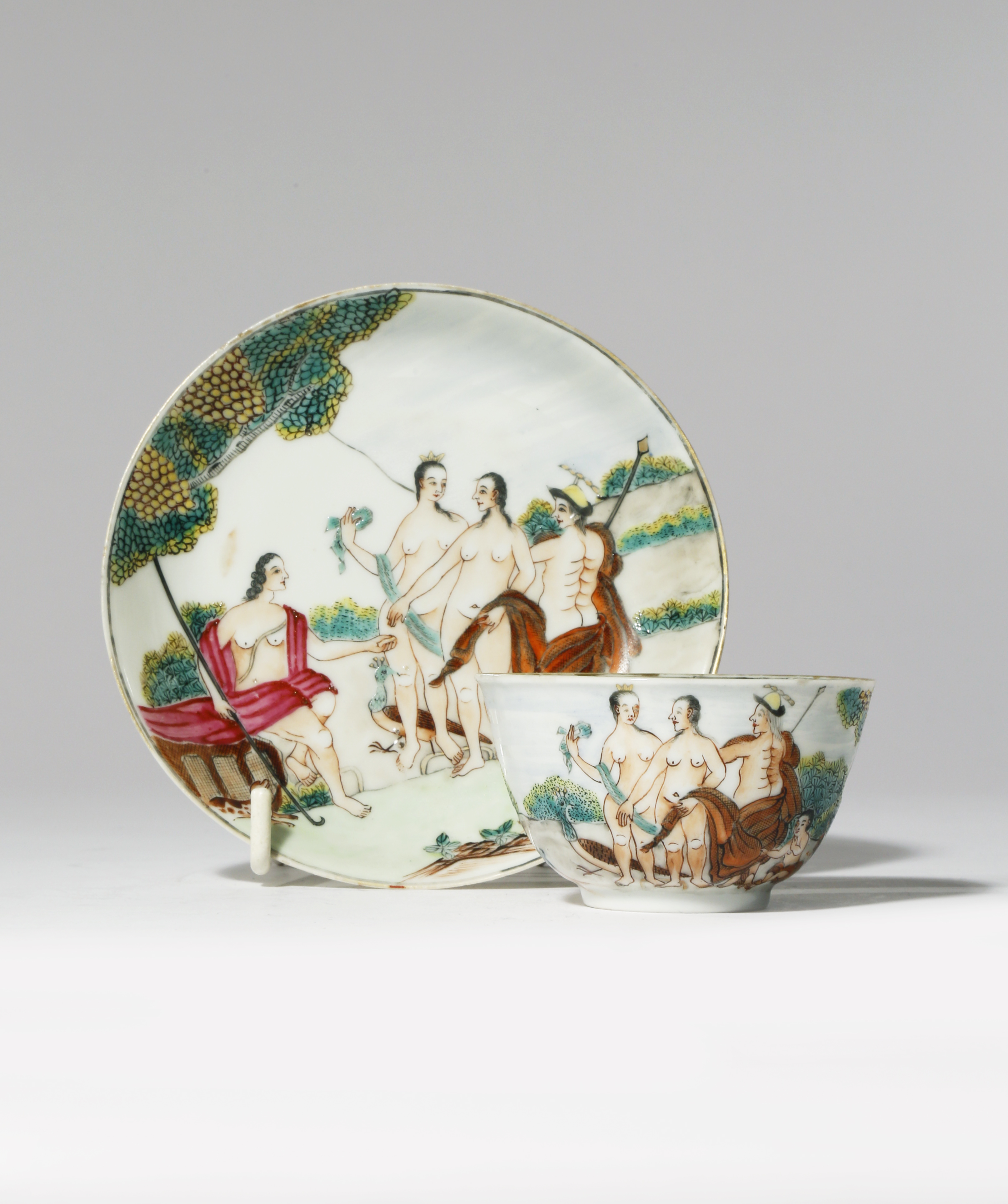 A CHINESE FAMILLE ROSE 'JUDGEMENT OF PARIS' TEA BOWL AND SAUCER C.1740 Brightly enamelled with...