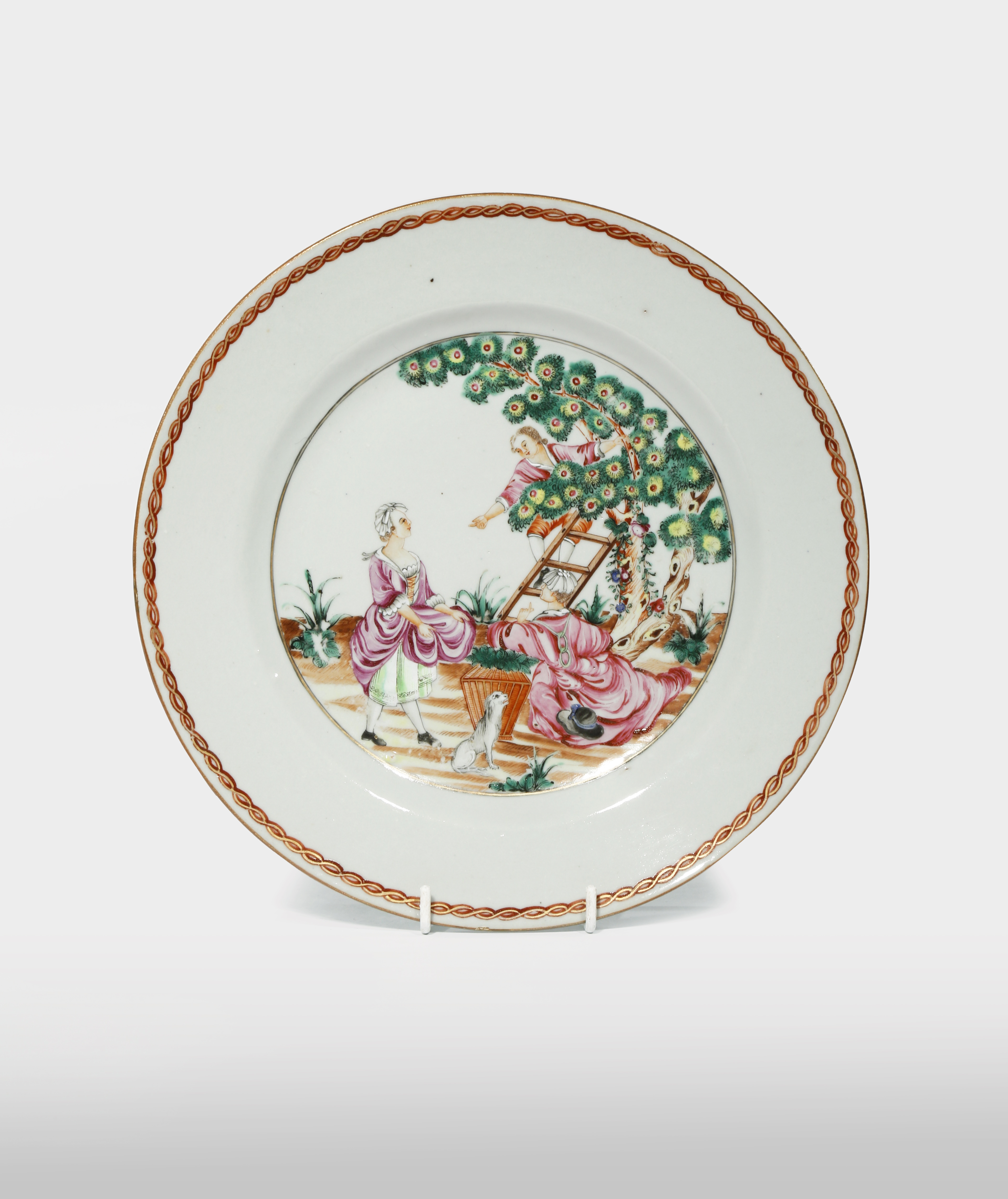 A CHINESE FAMILLE ROSE 'CHERRY PICKERS' PLATE C.1740 Depicting a young man up a ladder passing a...