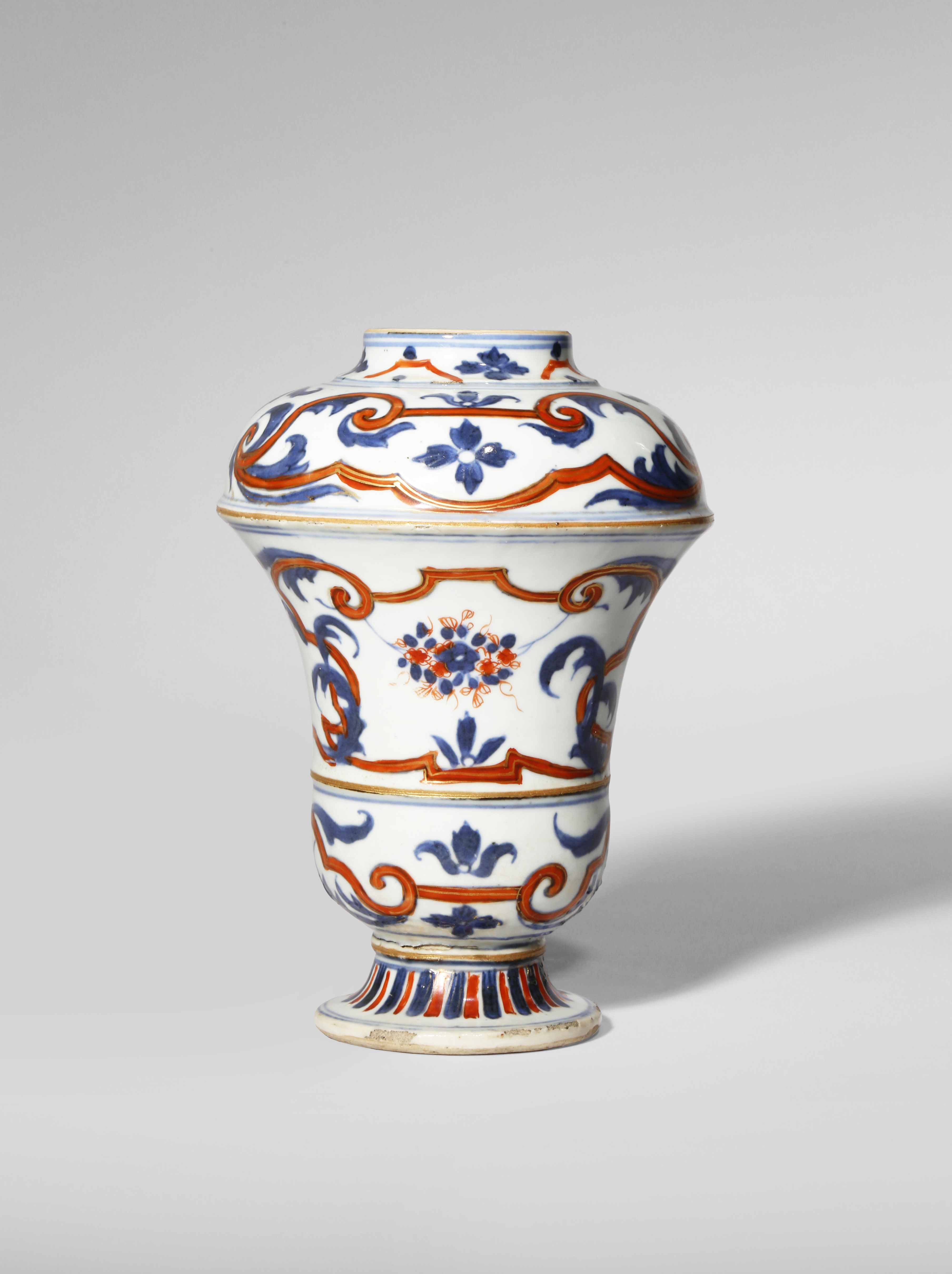 Painted in underglaze blue, iron-red and gilt with floral and foliate sprays amidst elaborate scrolls and plumes of feathers, all raised on a flaring foot decorated with alternating blue and red narrow lappets, 16.4cm.
