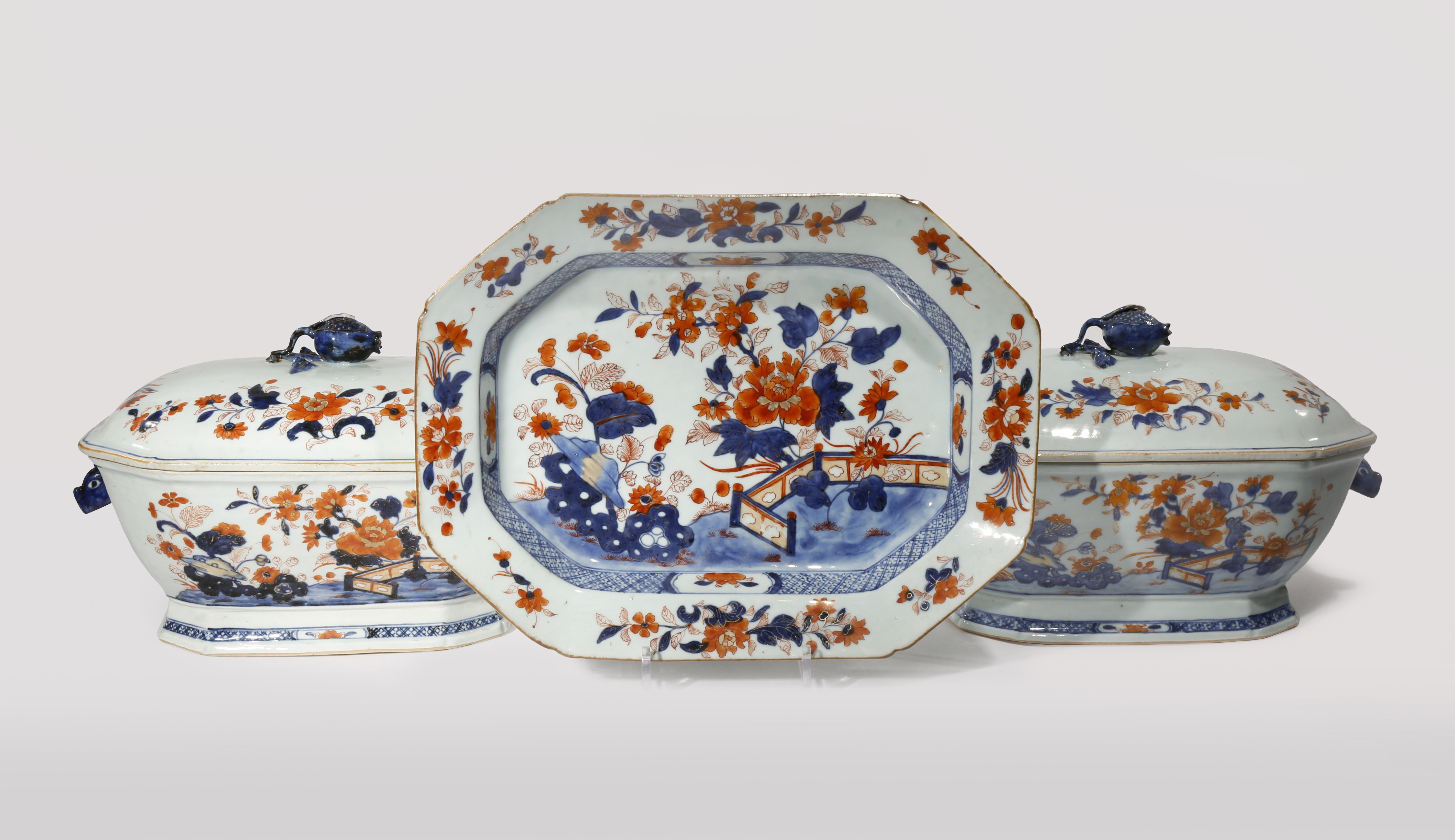 A NEAR PAIR OF CHINESE IMARI TUREENS AND COVERS QIANLONG 1736-95 The bodies painted with flowers...