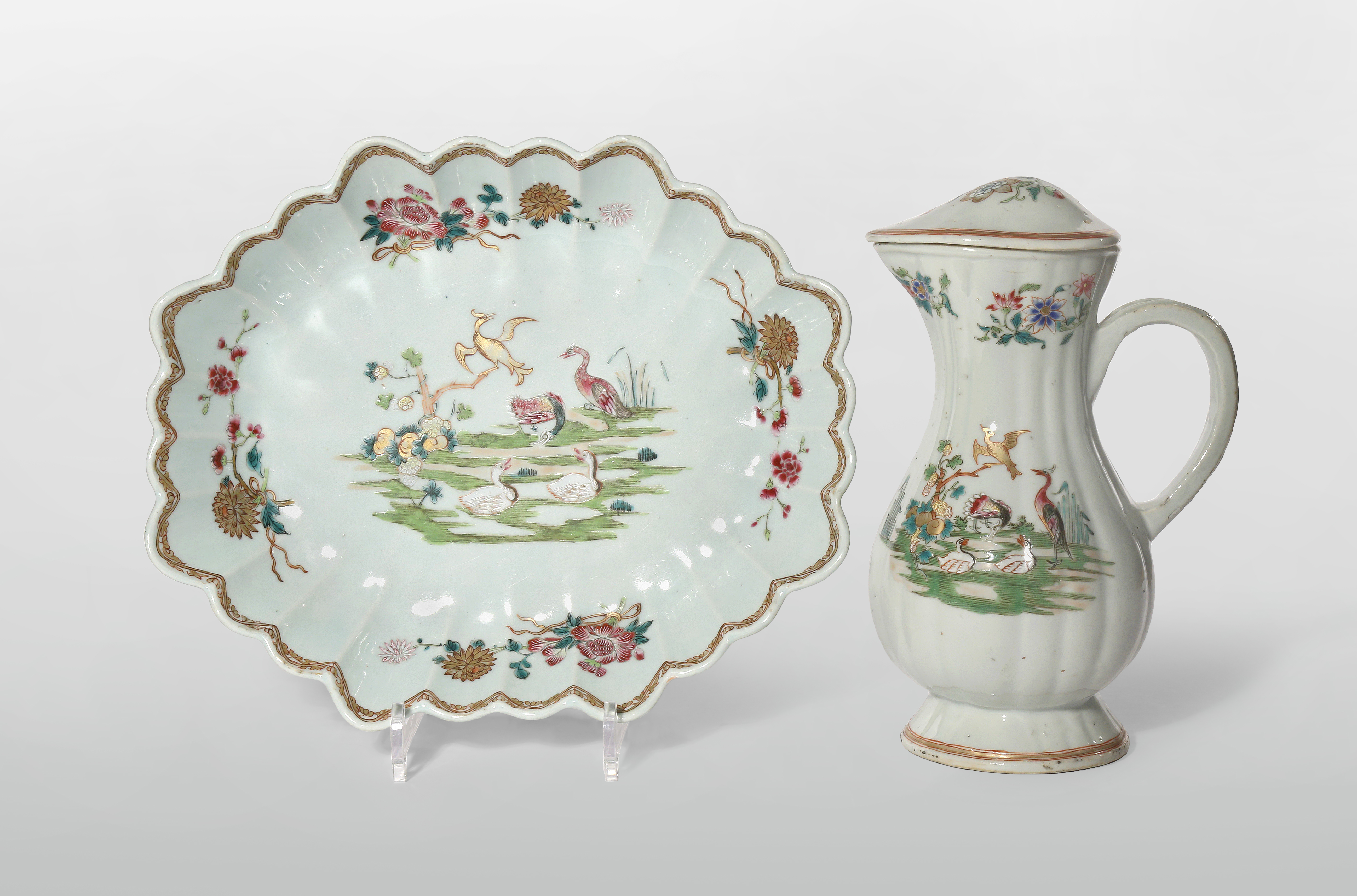 A CHINESE FAMILLE ROSE MOULDED BASIN, JUG AND COVER