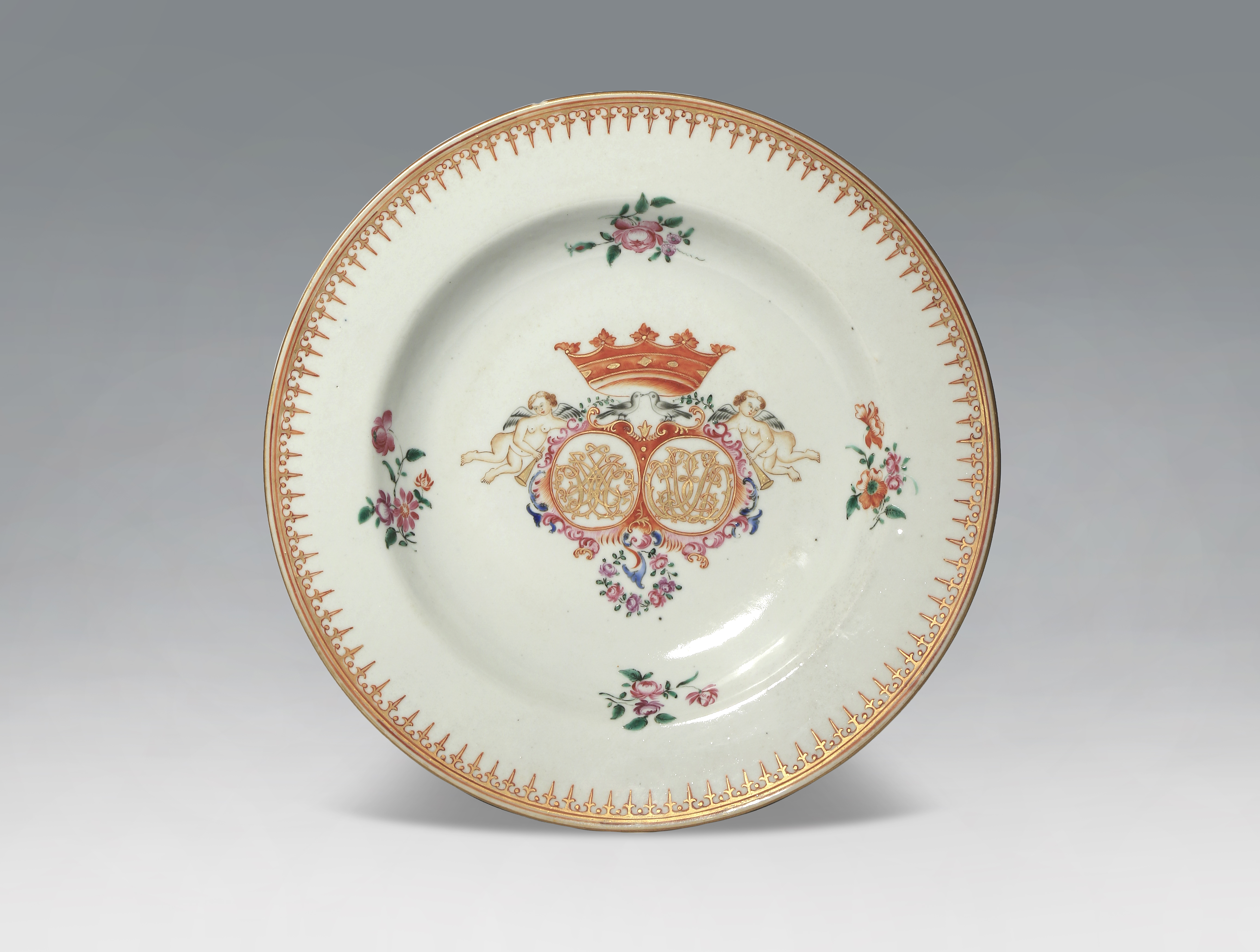 A CHINESE ARMORIAL SOUP PLATE 18TH CENTURY Painted to the well with two angels and a pair of...
