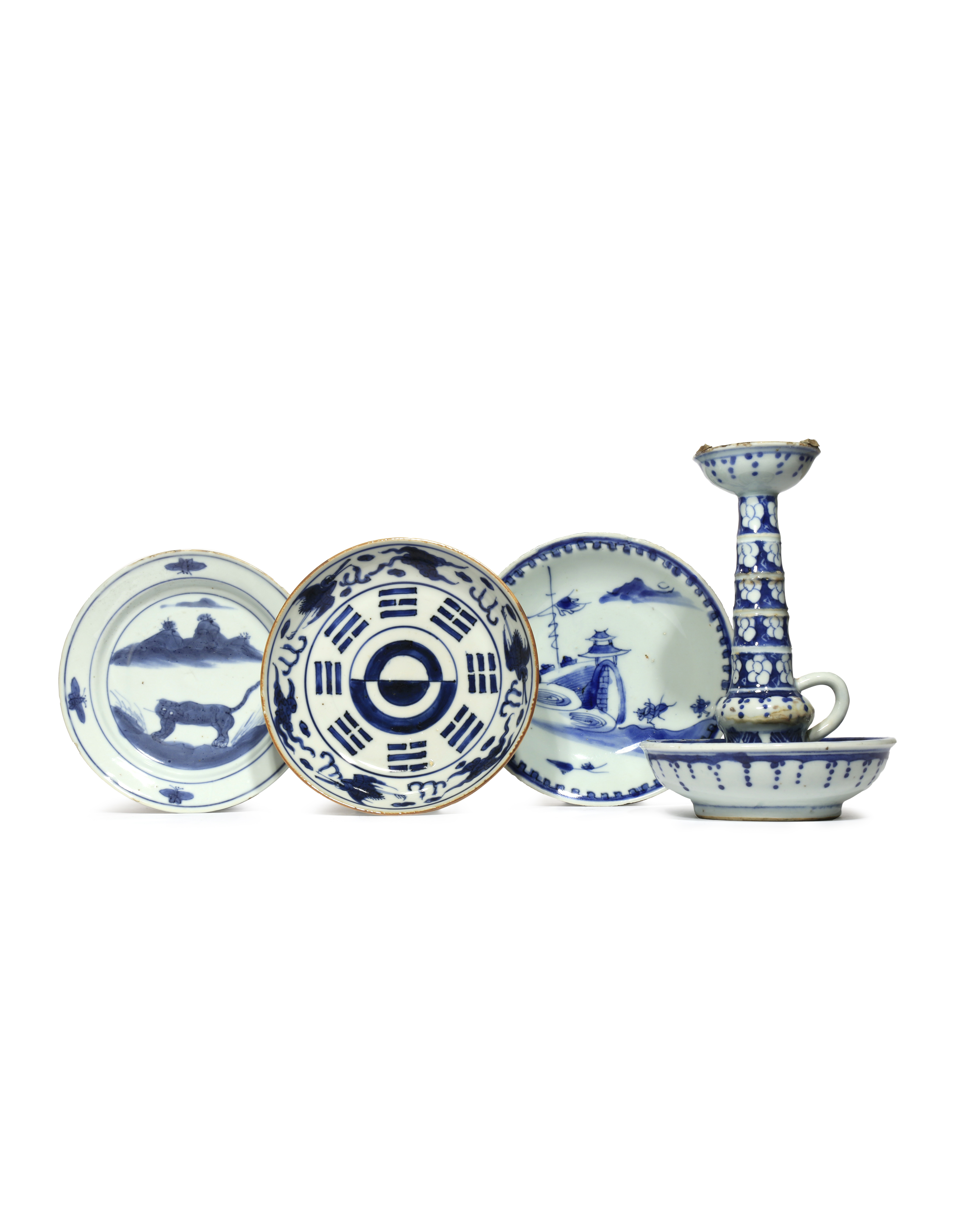 One decorated with a tiger in a mountainous river landscape, with four butterflies to the rim; another with a horse rider and his attendant approaching a fortified city; the third with the yin yang symbol surrounded by the eight trigrams, with cranes in flight to the cavetto, a six character Chenghua mark to the base; together with a 19th c. nightlight with a tall neck rising above a saucer decorated with flowerheads and clouds, 19cm max. (4)