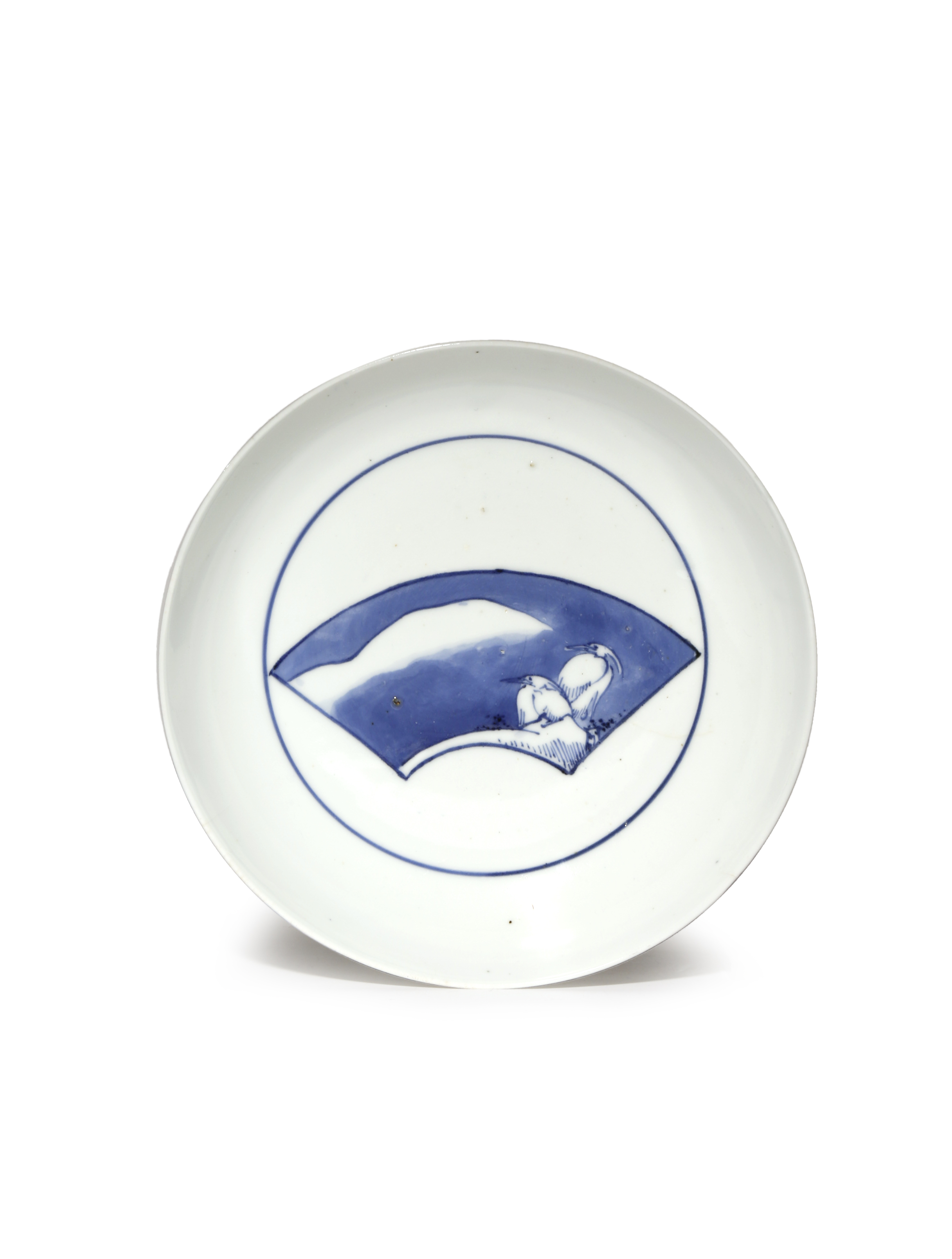 The well decorated in underglaze blue with a fan-shaped panel enclosing two stylised egrets, the silhouette of a mountain visible in the distance, the underside with three concentric rings and raised on a short foot, a two character mark to the base, 17.2cm.
