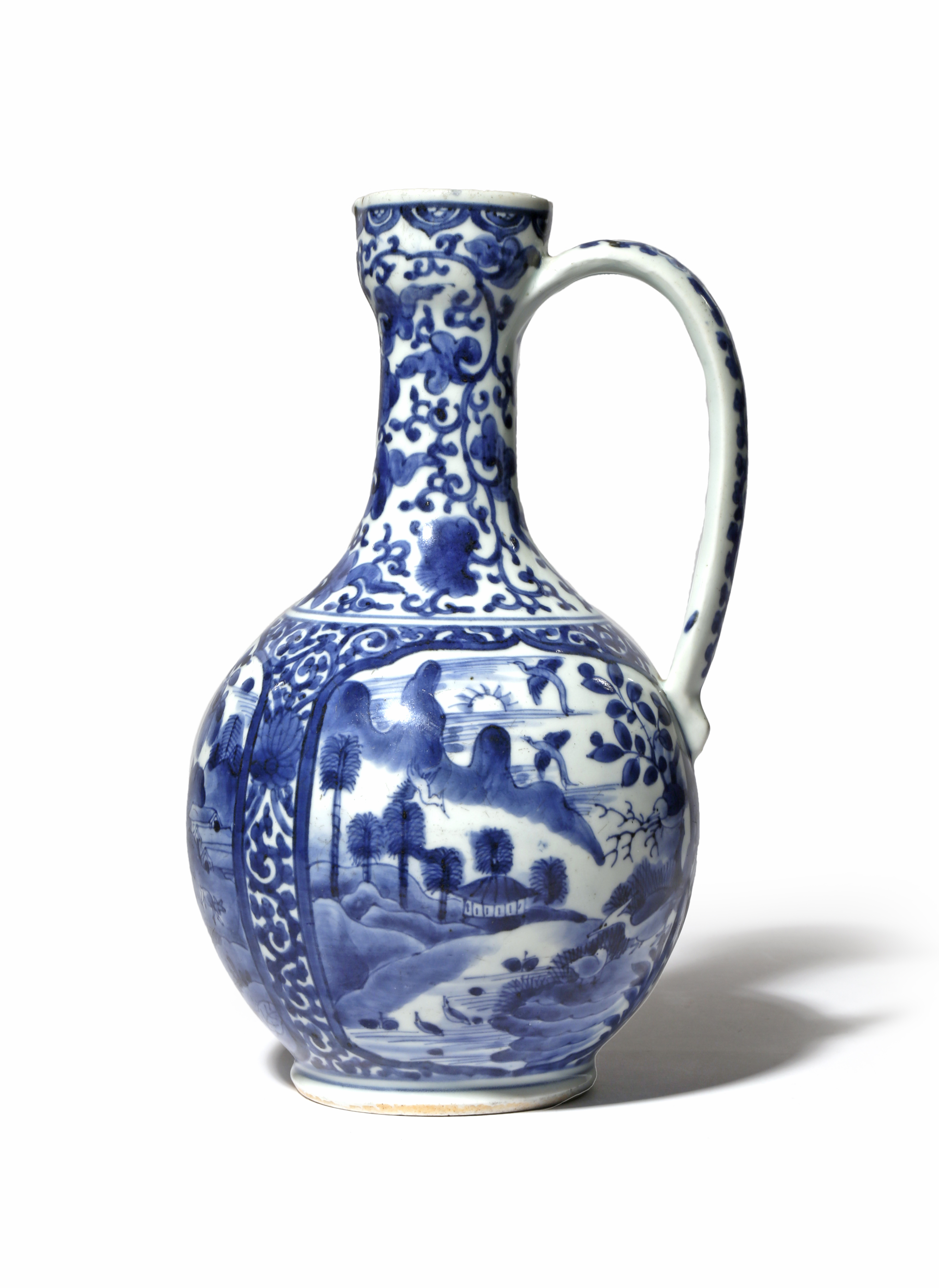 The bulbous body with a tall neck and elegantly curved handle, decorated in underglaze blue with three shaped panels depicting figures in mountainous river landscapes on a ground of karakusa scrolls, the neck and handle with formal flowers and further scrolling tendrils, 23.5cm.