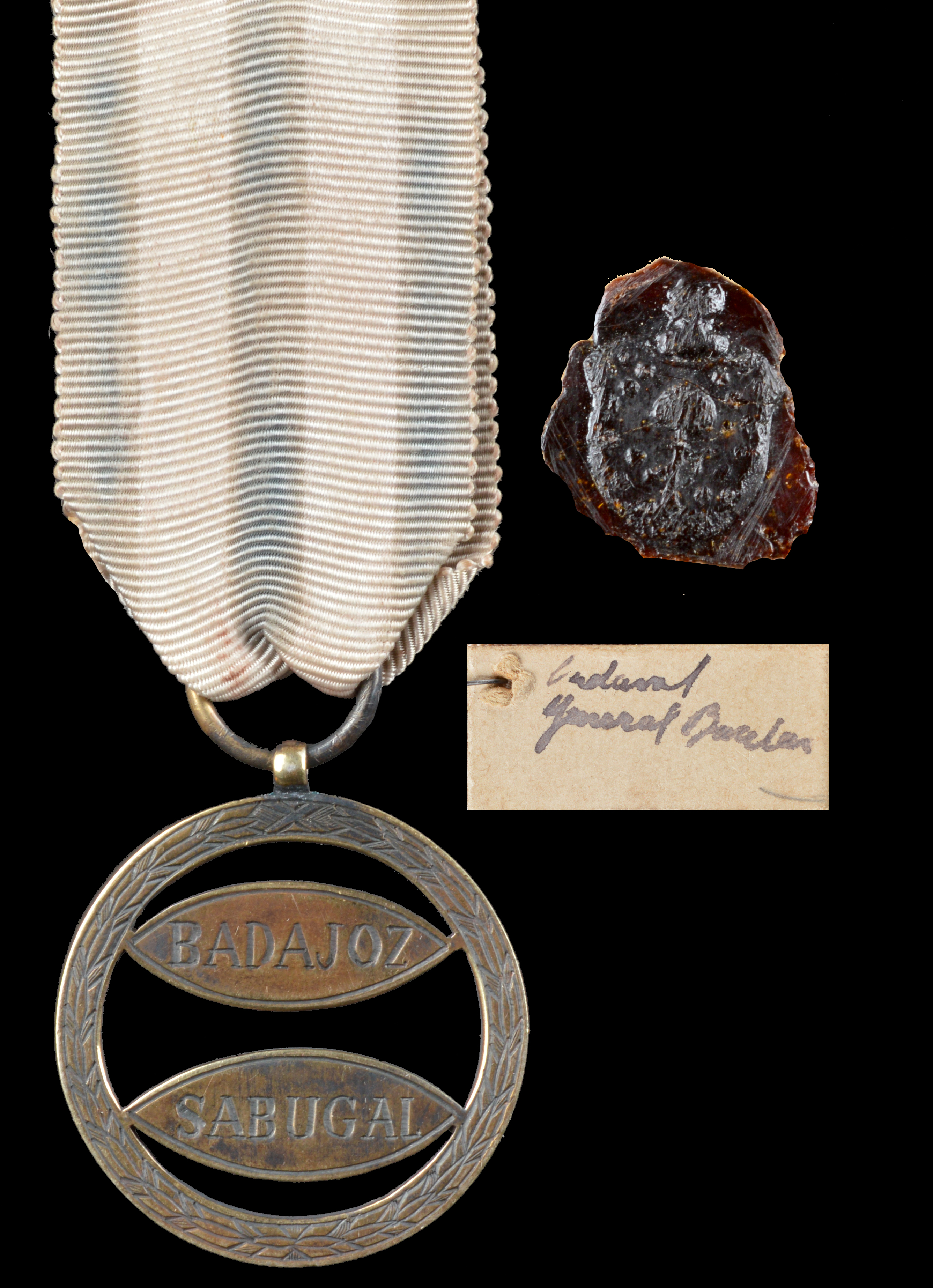 Portugal: Medal for Badajoz and Sabugal, silver gilt, 3 mm, 'BADAJOZ' and 'SABUGAL' engraved to two central leaves, plain reverse, ring suspension with blue and white ribbon, small label with ink inscription and set with a wax seal, very fine.
