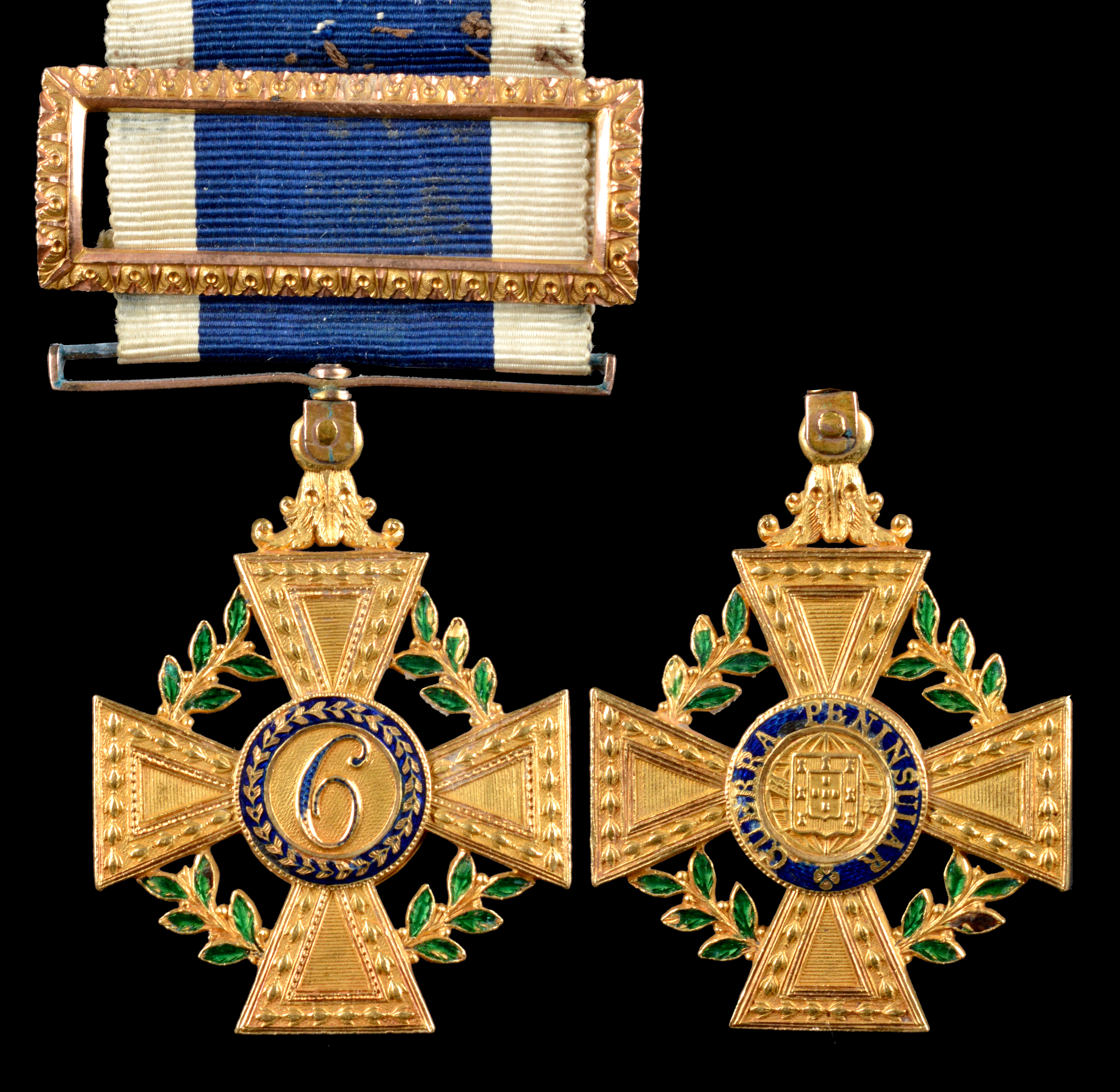 Portugal: Peninsula War, campaign cross for 6 years, gold and enamel, 35mm, gilt suspension bar, ornate gold slide buckle with white edged blue ribbon, some loss to enamel, otherwise good very fine.
