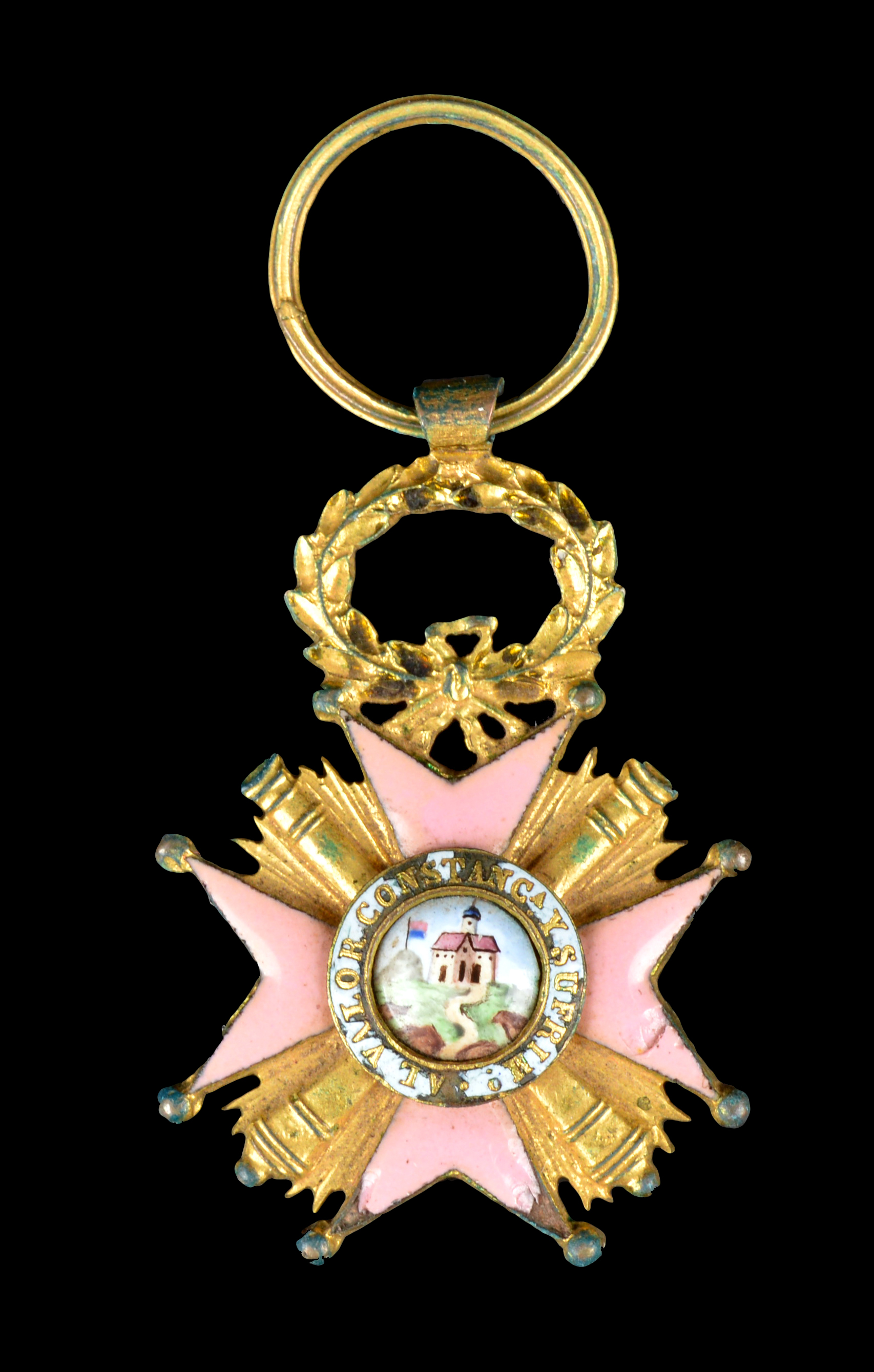 Spain: Cross for The Defence of the Sanctuary of Our Lady of Hort 1836, gilt and enamel, 23.4 mm, pink eight pointed cross with cannons between the arms, loss to enamel, good fine.