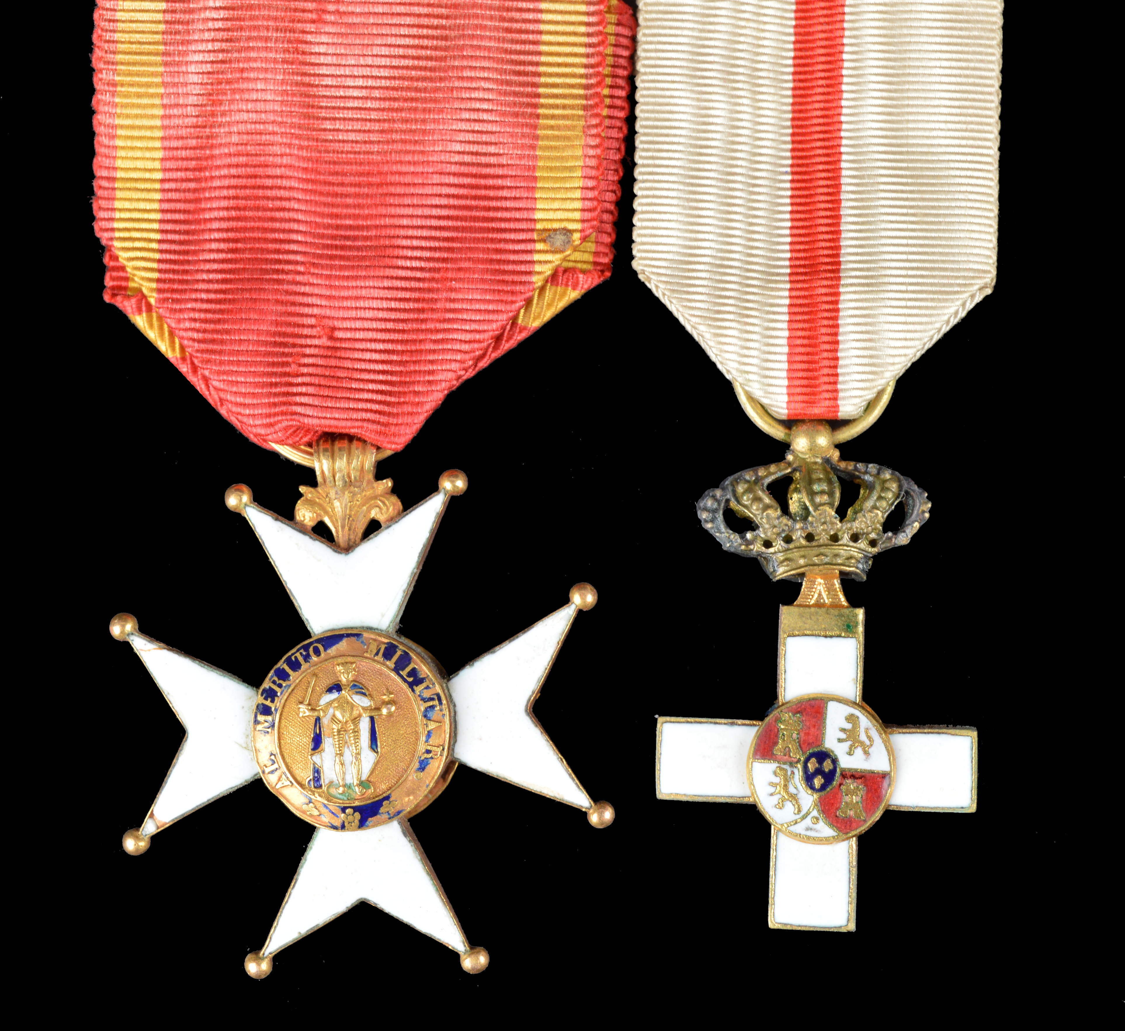 Spain: the Order of Military Merit, reduced size enamelled cross, 23.7 mm, white arms, crown suspension, minor enamel damage, very fine; together with th Order of San Fernando, enamelled cross, 36.8 mm, much loss to enamel. [2]