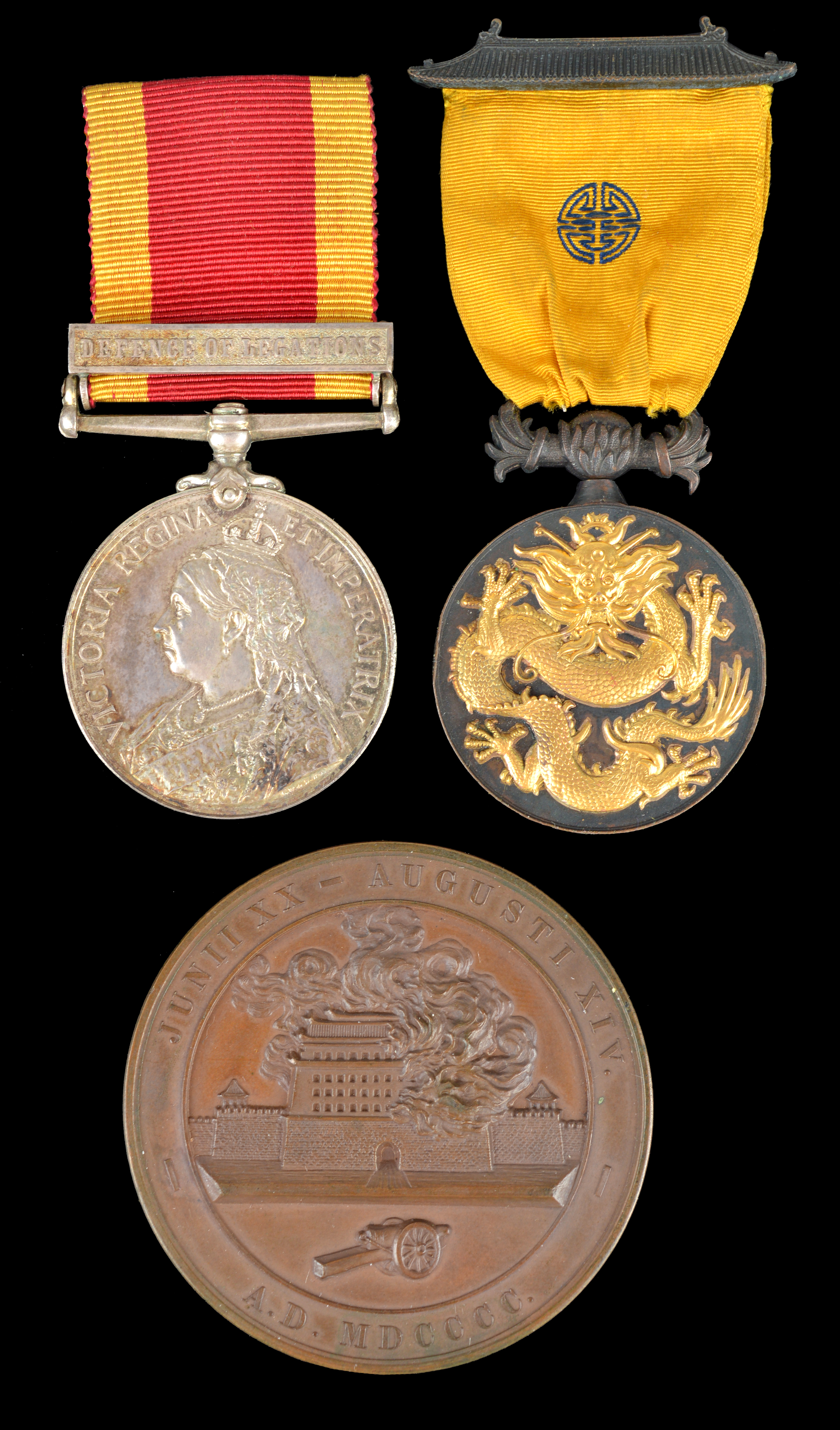 The rare and historically important Defence of Legations group of medal to Arthur D. Brent, Hong Kong and Shanghai Bank: China Medal 1900, clasp: Defence of Legations (A.D. BRENT. H. K. & S. BANK); U.S.A.: Military Order of the Dragon, China 1900, with original ribbon and pagoda roof suspension bar (ARTHUR D. BRENT BRITISH LEGATION DEFENCE No 738), engraved to the reverse; Peking Seige Commemoration Medal, bronze, 57 mm, burning of the Chien Men, reverse: figures representing Europe, Japan and America trampling a Chinese dragon, in fitted J. Tayler Foot case with original explanatory notice (A.D. BRENT. (H.K.& S. BANK)), impressed to the rim, all extremely fine and rare. [3]
