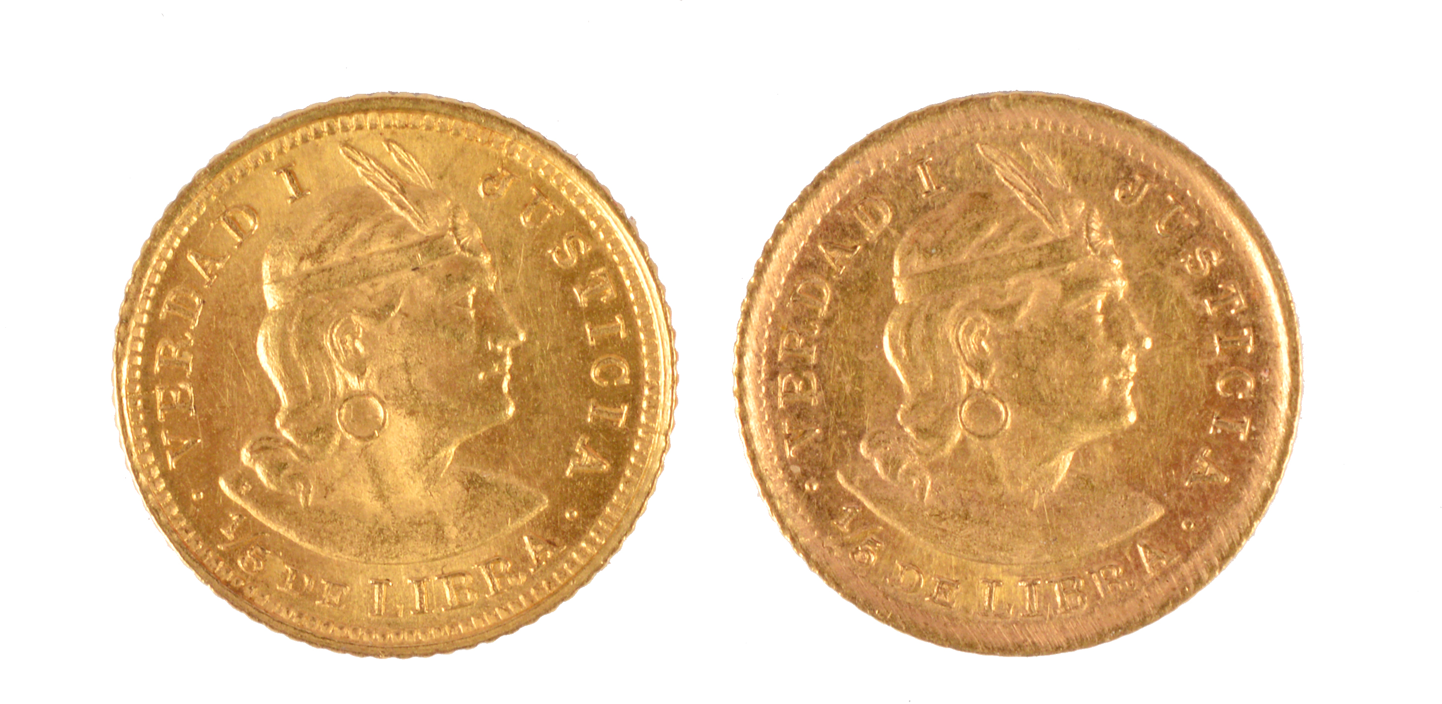 Peru: trade coinage, gold 1/5 libra, 1910, 1911 (KM 210), extremely fine. [2]