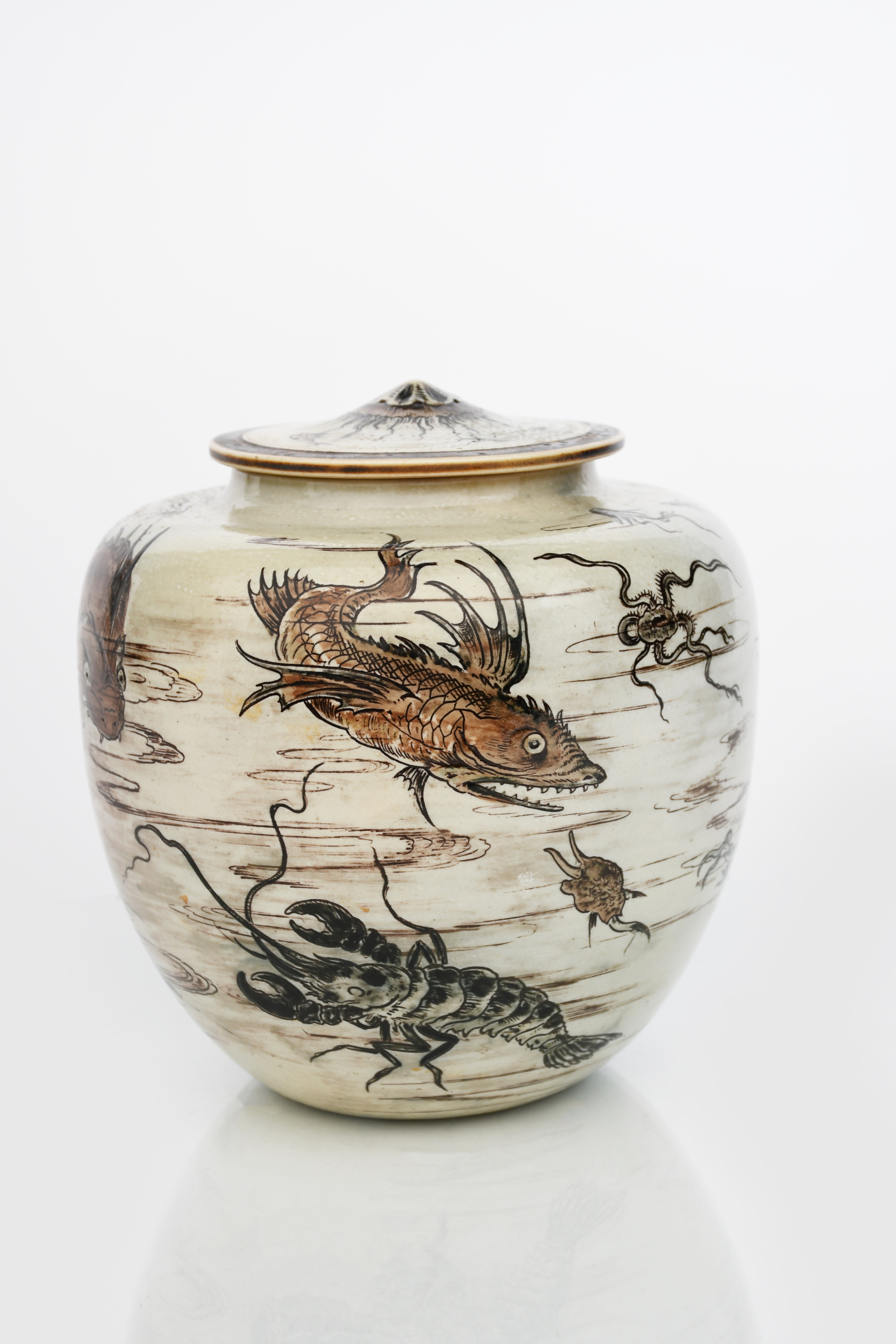 A fine Martin Brothers stoneware Aquatic vase and cover by Edwin and Walter Martin, dated 1896, shouldered form, incised and painted with grotesque fish, jelly fish, crabs and aquatic creatures swimming amongst waterweed, a large lobster at the base of the vase, in shades of brown, cream and black on a pale mushroom ground, the flat circular cover with raised limpet knop, incised 10 1896 Martin Bros London & Southall, Martin Brothers paper label, Richard Dennis Exhibition label, 20cm. high