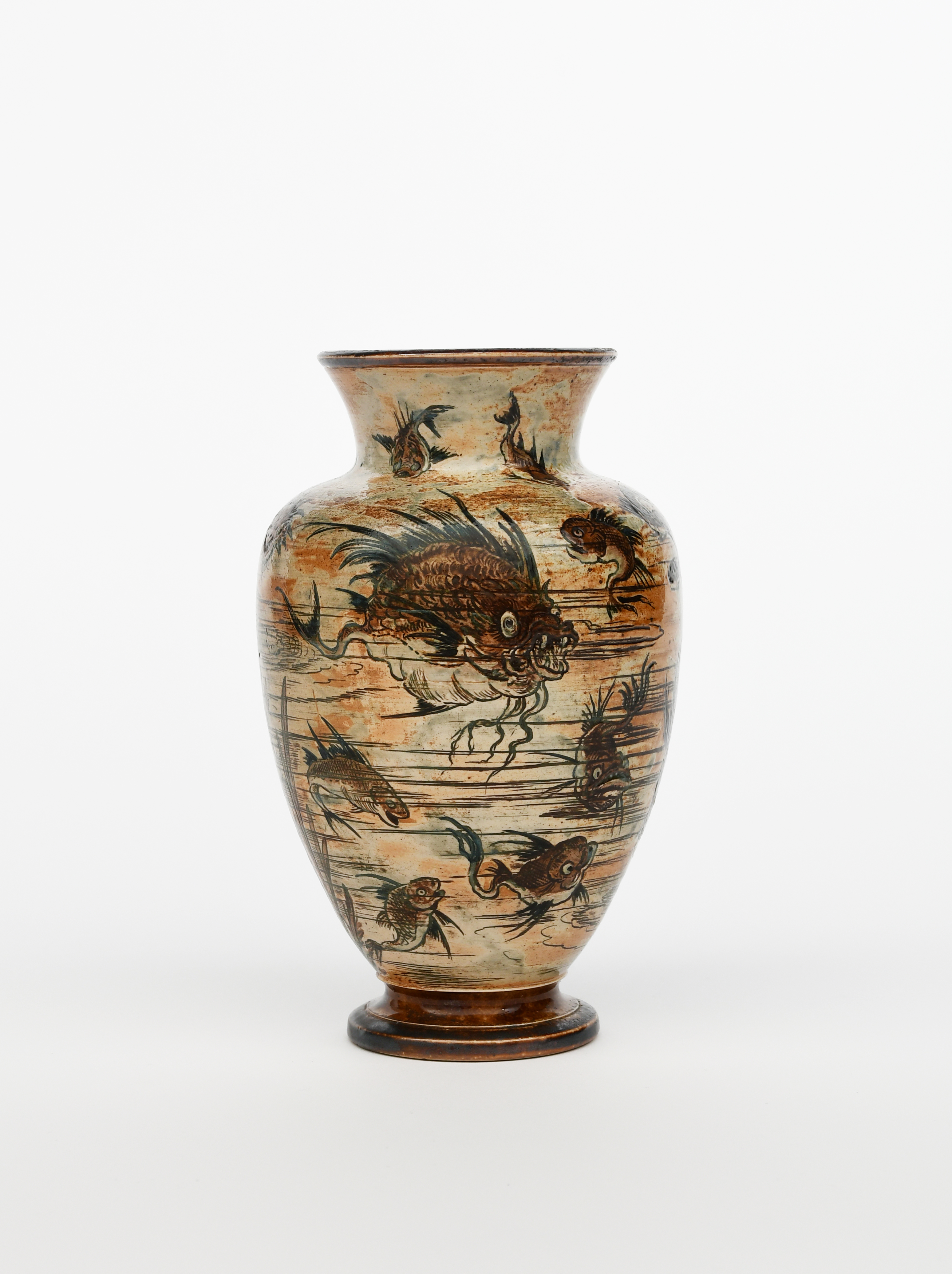 A Martin Brothers stoneware Aquatic vase by Edwin and Walter Martin, baluster form, incised and painted with grotesque fish, an eel and aquatic creatures swimming amongst waterweed, in brown, blue and green, highlighted in white on a tan ground, incised Martin Bros London & Southall, 20.5cm. high
