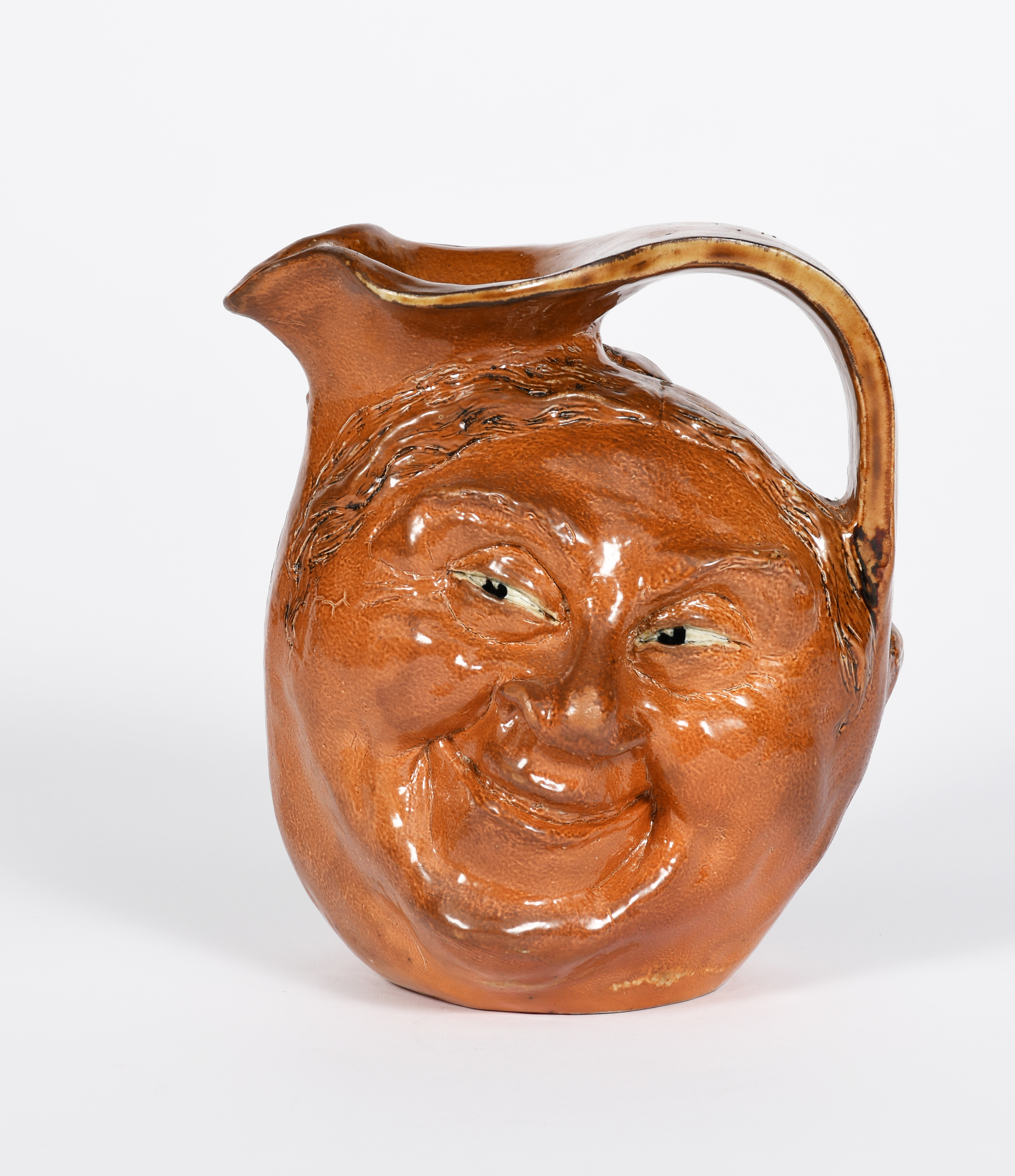 A Martin Brothers stoneware face jug by Robert Wallace Martin, dated 1905, modelled to one side with a smiling face, the reverse and more smug grin, glazed brown with white and black highlights, incised 1-1905 R W Martin & Bros, London & Southall, paper label numbered 78, 17cm. high