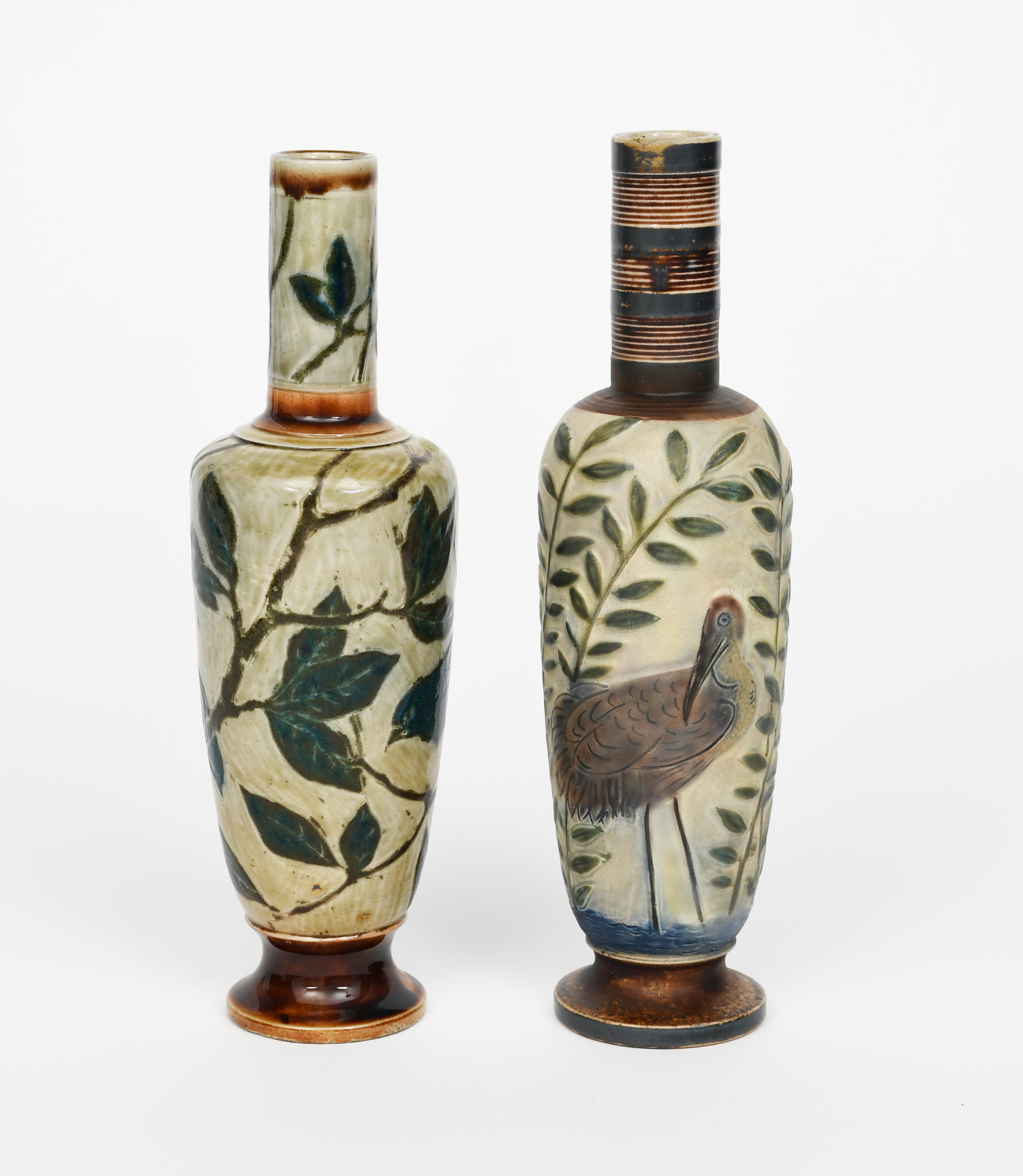 A Martin Brothers stoneware vase by Robert Wallace Martin, dated 1880, shouldered from with cylindrical neck, incised and painted with a pair of birds perched in tree boughs, in green, blue and brown on a mushroom ground, and another similar dated 1886 modelled with cranes, main vase incised 13.1.80 R W Martin London & Southall, restored, 24cm. high, (2)