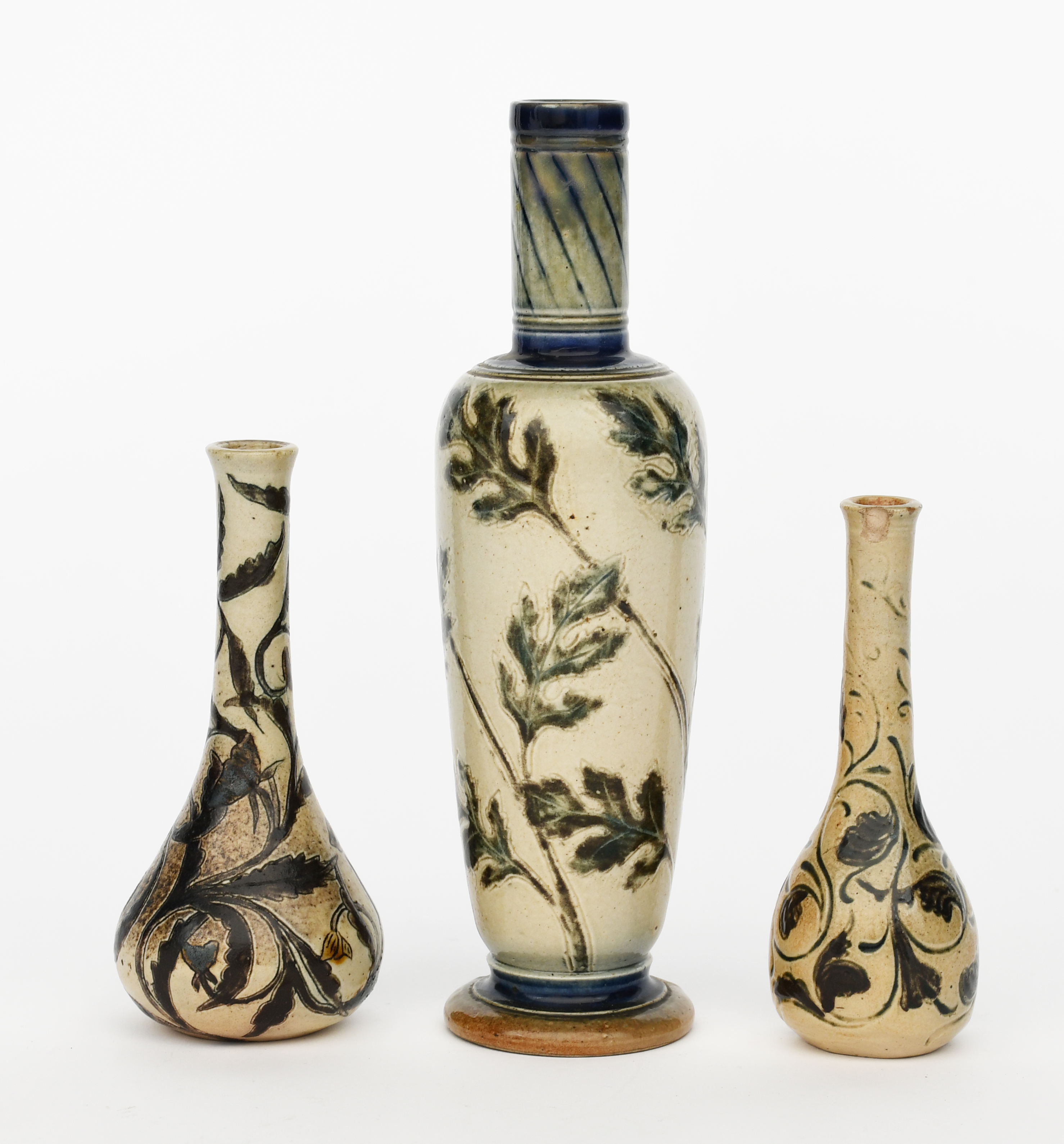 A Martin Brothers stoneware vase by Robert Wallace Martin, shouldered form with cylindrical neck, incised with a band of foliage in green and ochre on a buff ground, with blue bands, and two other Martin Brothers vases R W Martin Southall, restored, 23.5cm. high (3)