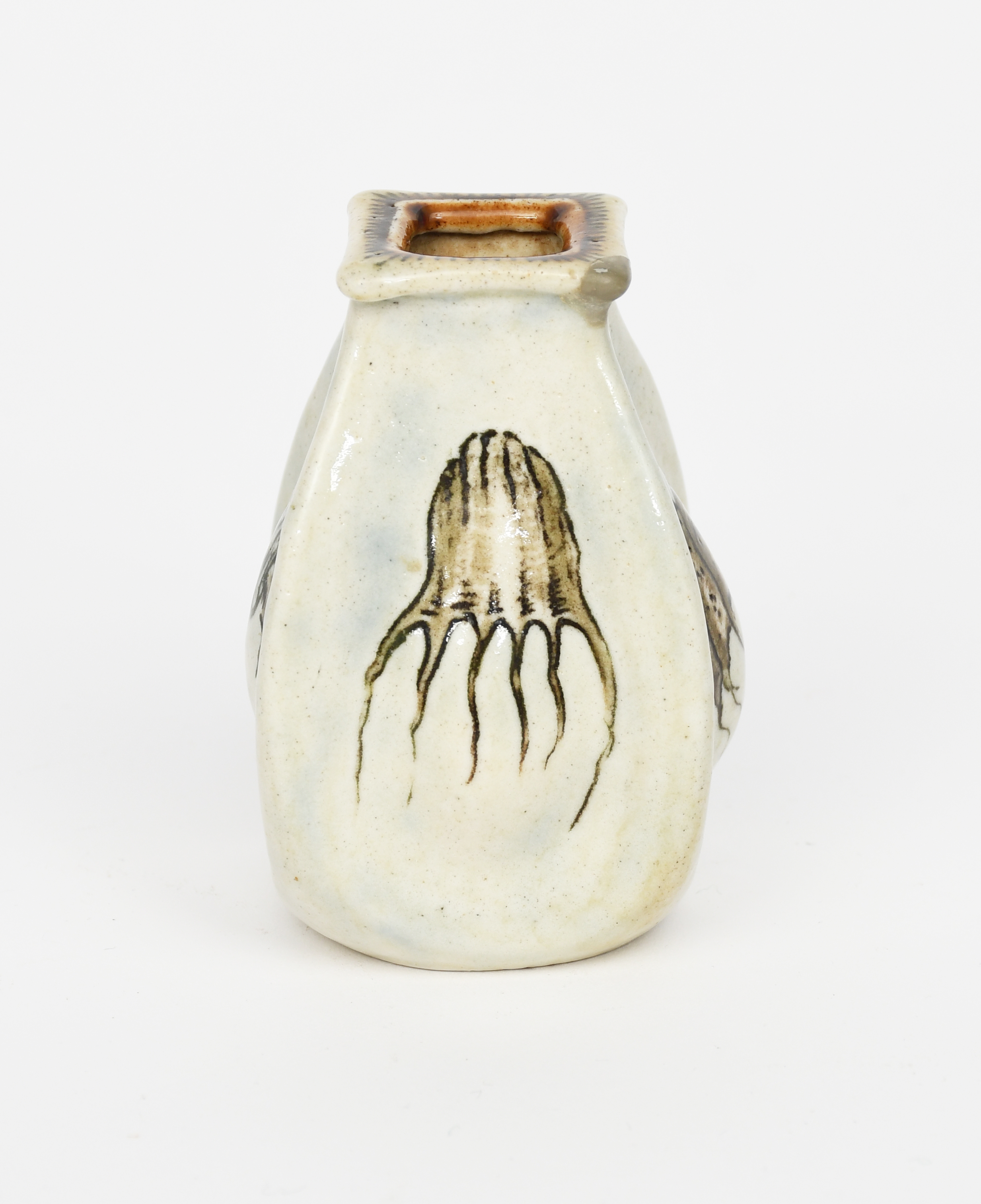 A Martin Brothers stoneware aquatic vase by Edwin and Walter Martin, dated 1901, modelled, swollen square section, painted with a jelly fish to each side, in green on a pale celadon ground, the rim highlighted with brown, incised 1-1901 Martin Bros London and Southall, museum restoration to one top rim corner, 8cm. high