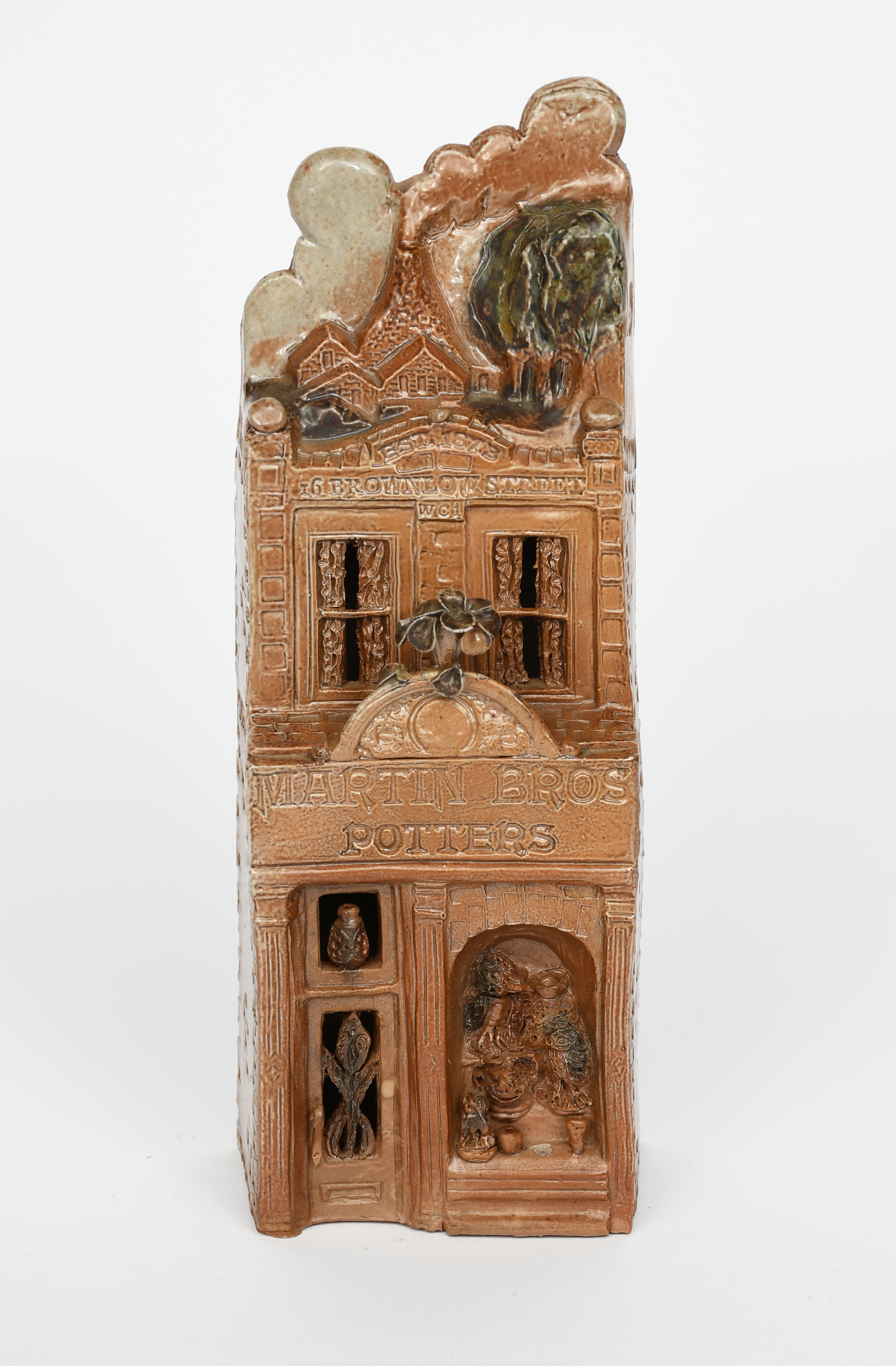 The Martin Brothers Potters a salt-glaze stoneware invite designed by Ian Gregory, inviting Rhys Morgan to the 1978 Richard Dennis Exhibition, modelled as the Martin Brothers pottery ay 16 Brownlow Street, impressed marks, annotated to Rhys Morgan, 25.5cm. high