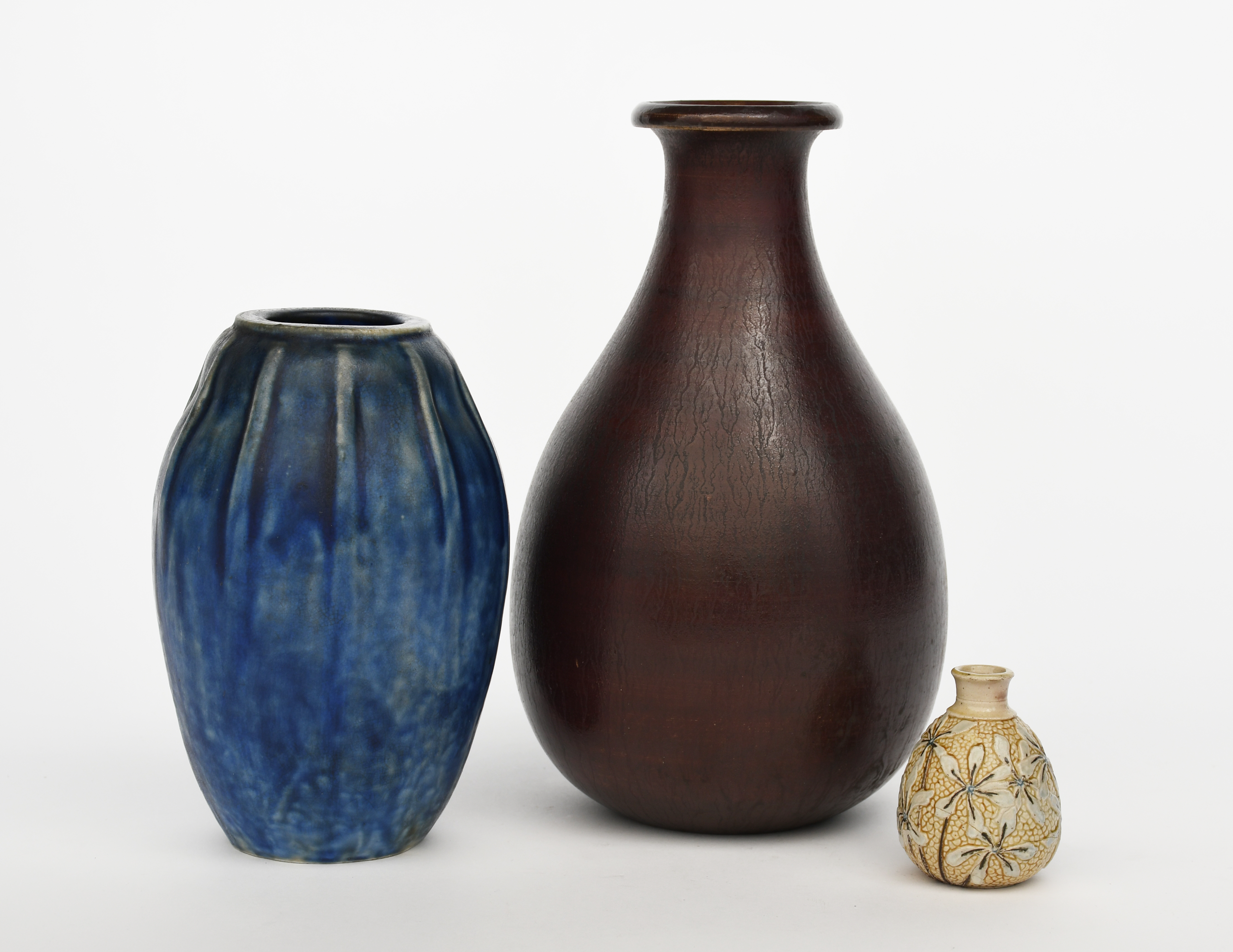 A Martin Brothers stoneware gourd vase by Edwin and Walter Martin, pear shaped, modelled in low relief with textured ground and white flowerheads, another Martin Brothers gourd vase glazed blue and a tall brown pear shaped gourd vase, incised Martin London, crack to base of main vase, 7.5cm. high (3)