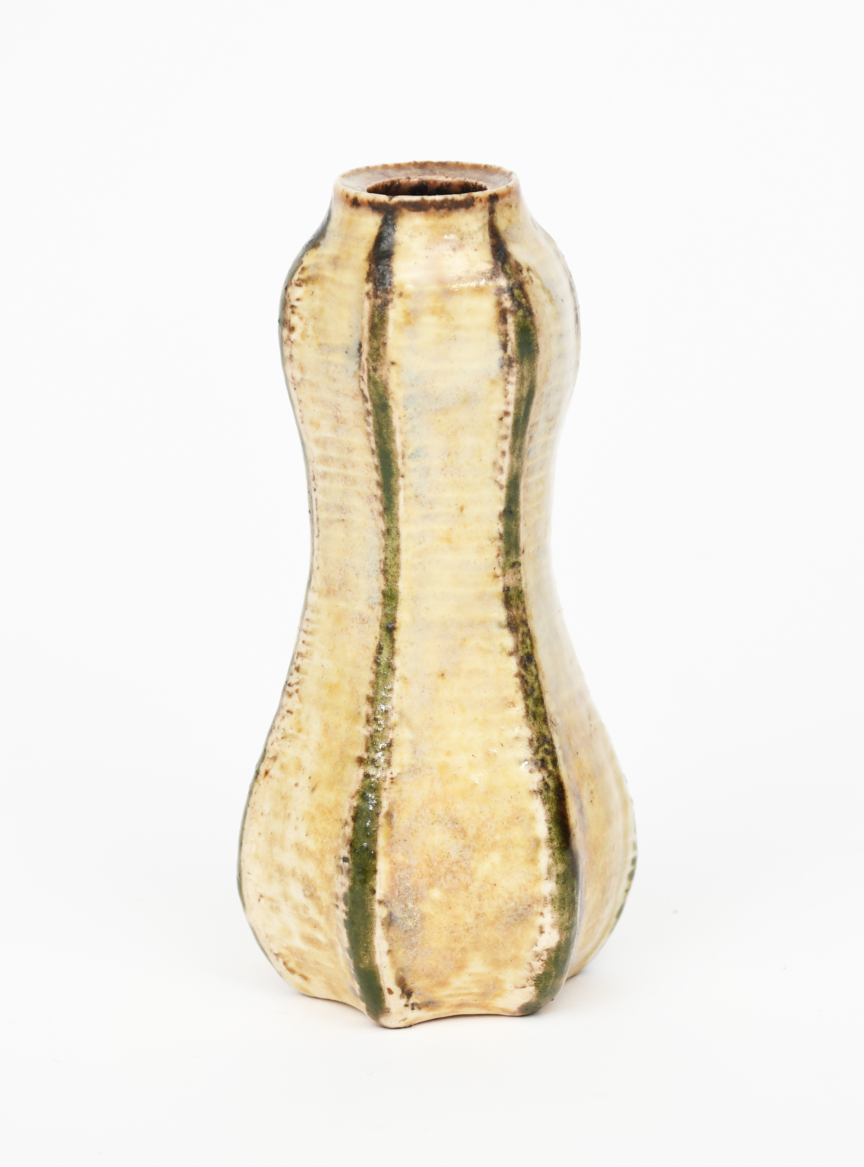 A Martin Brothers stoneware gourd vase by Edwin and Walter Martin, dated 1907, waisted hexagonal form, with painted green ribs on a buff ground incised 7-1907 Martin Bros London & Southall, 12.5cm. high