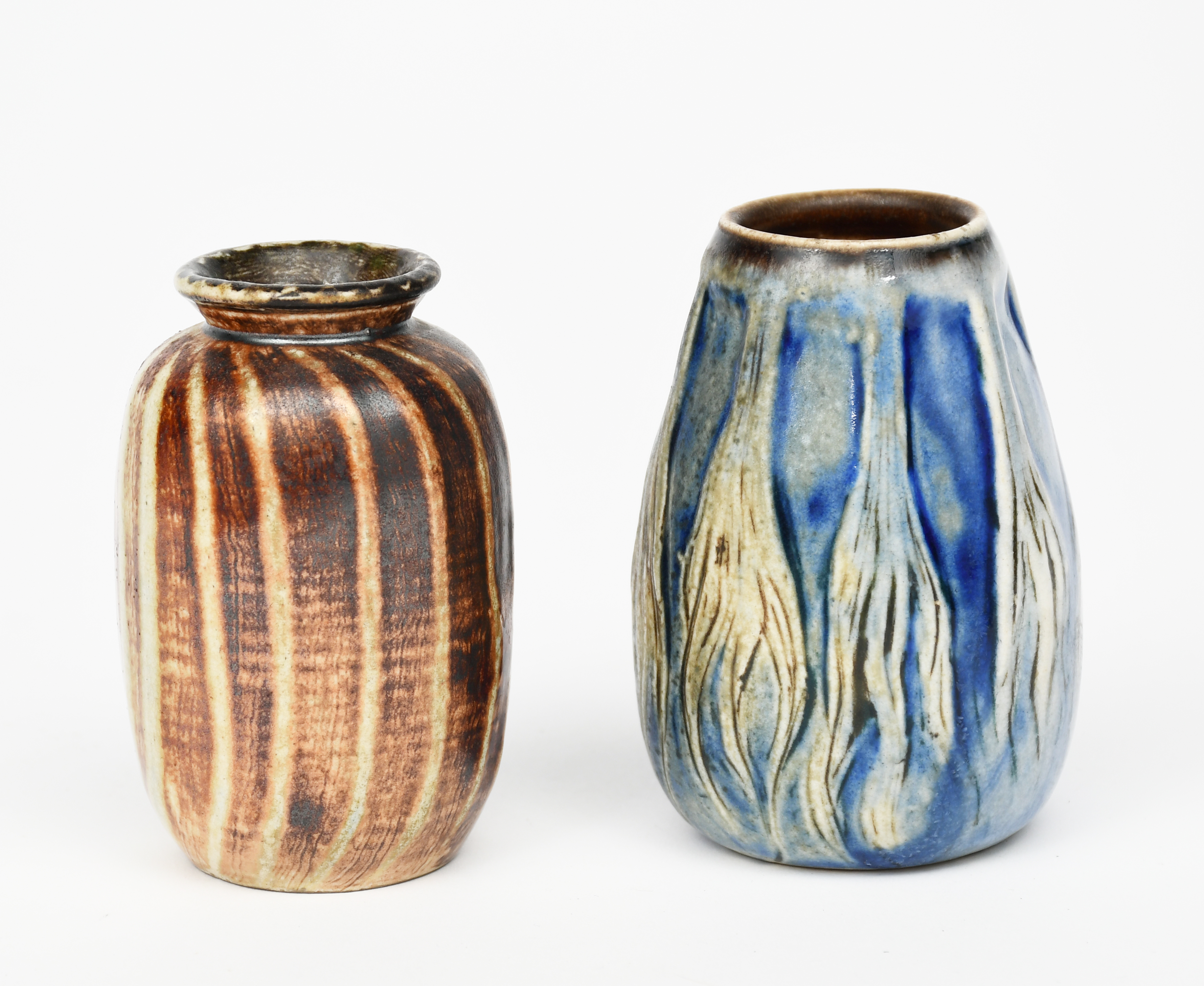 A Martin Brothers stoneware gourd vase by Edwin and Walter Martin, dated 1896, shouldered form, with simple rib decoration, glazed brown over buff, and another Martin Brothers stoneware gourd incised 2-96 Martin Bros London 8.5cm. high (2)