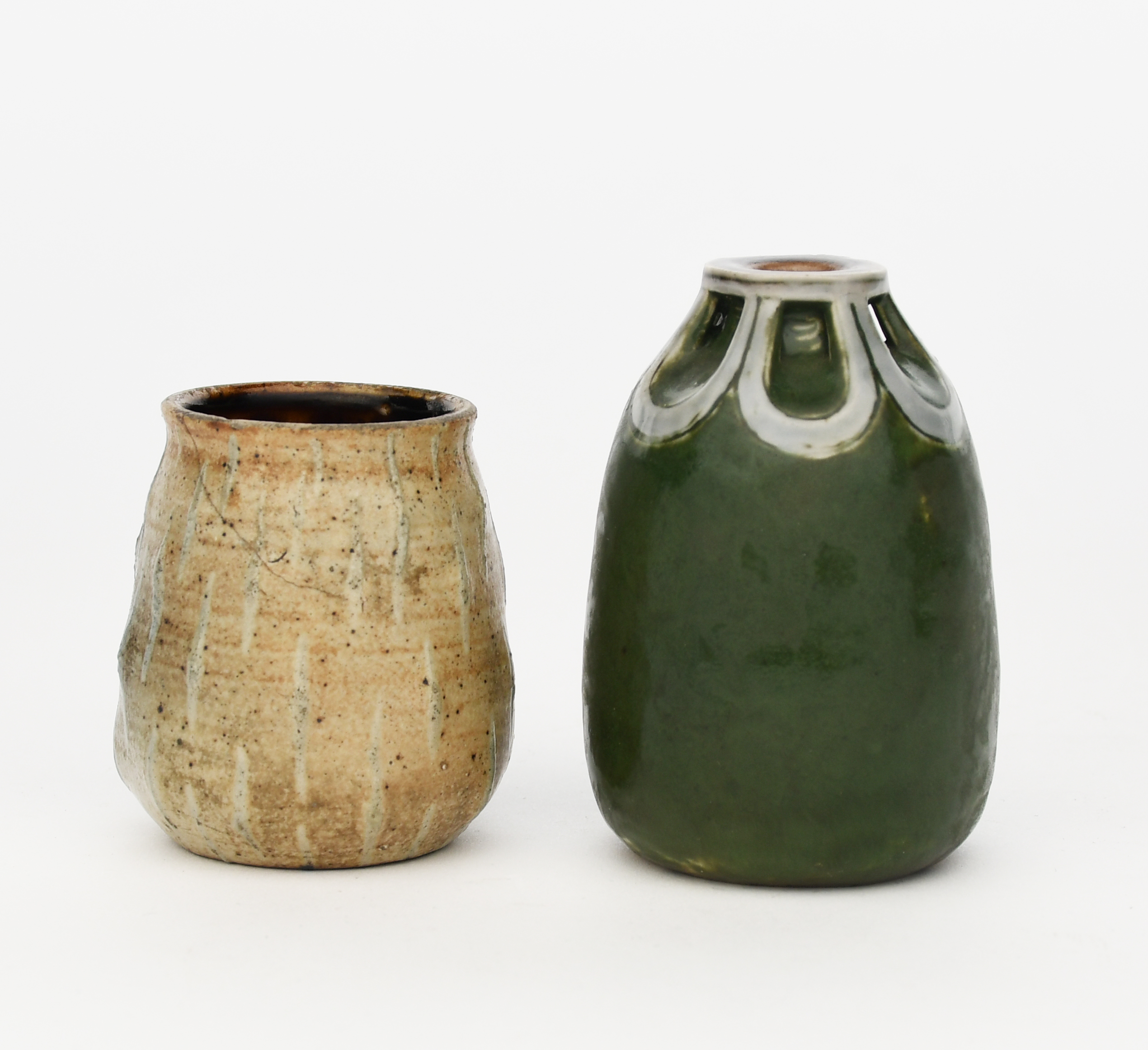 A Martin Brothers stoneware gourd vase by Edwin and Walter Martin, dated 1903, shouldered form, incised decoration to the shoulder, glazed green with grey highlights, and another Martin Brothers stoneware gourd with simple bid decoration, incised 8-1903 Martin Bros London & Southall, second vase hairline top rim, 8cm. high, (2)