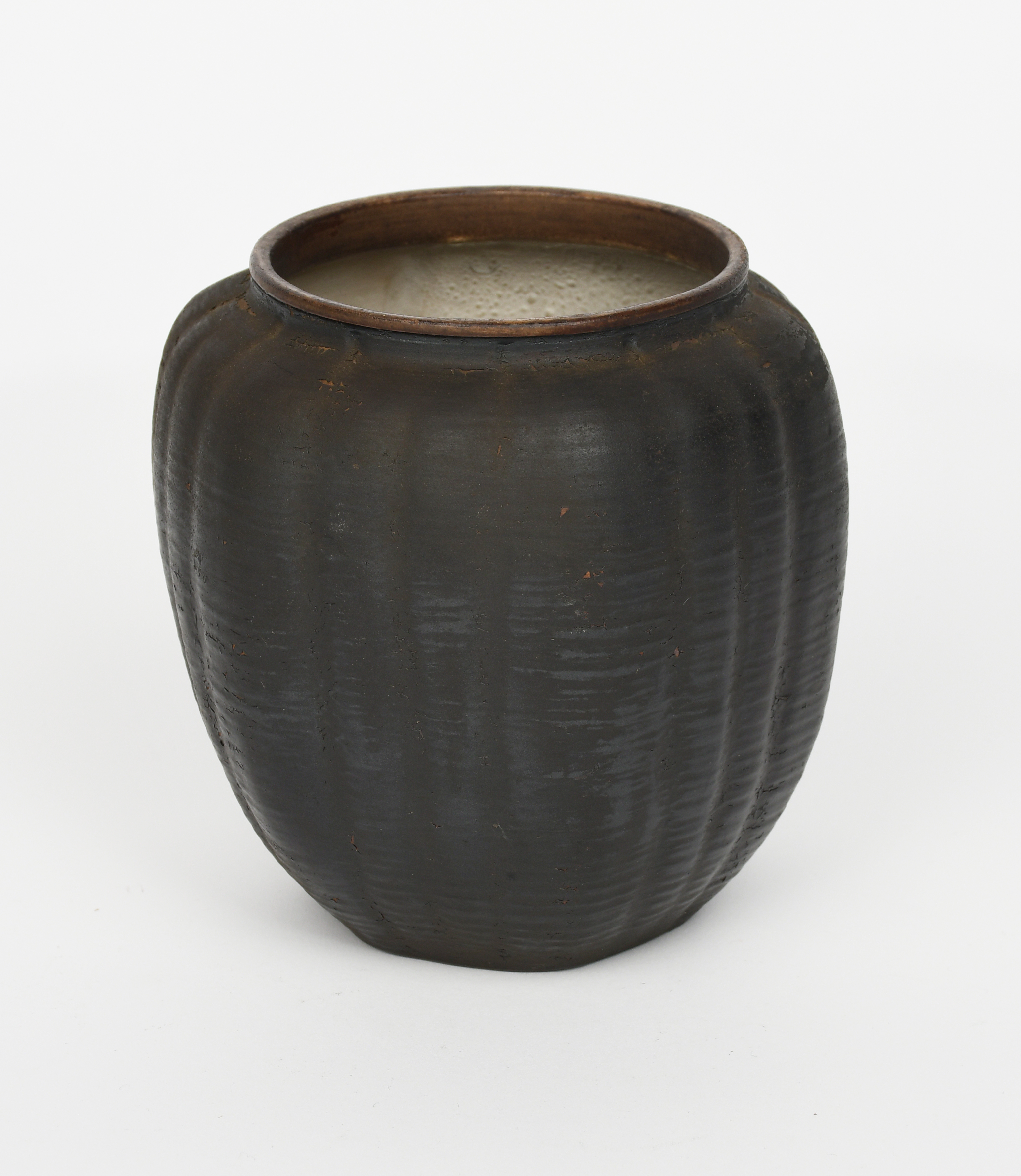 A Martin Brothers stoneware gourd vase by Edwin and Walter Martin, dated 1910, shouldered form with light vertical modelled ribs, glazed matt bronze with chestnut brown rim, incised 5-1910 Martin Bros, London & Southall, 16.5cm. high