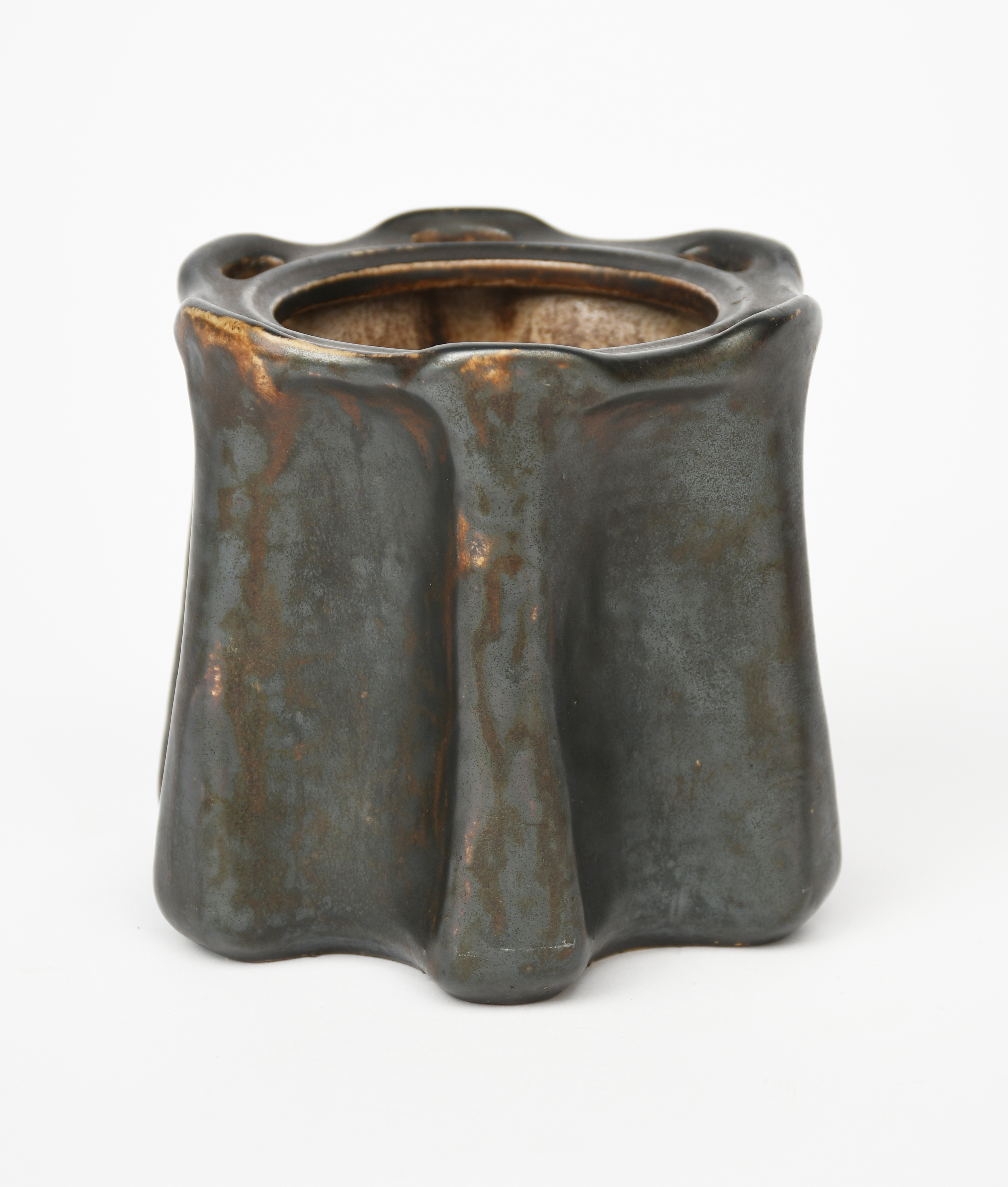 A Martin Brothers stoneware gourd vase by Edwin and Walter Martin, lobed cylindrical form with pierced top rim, covered in a bronze glaze incised Southall Potteries, Martin Bros, 13cm. high