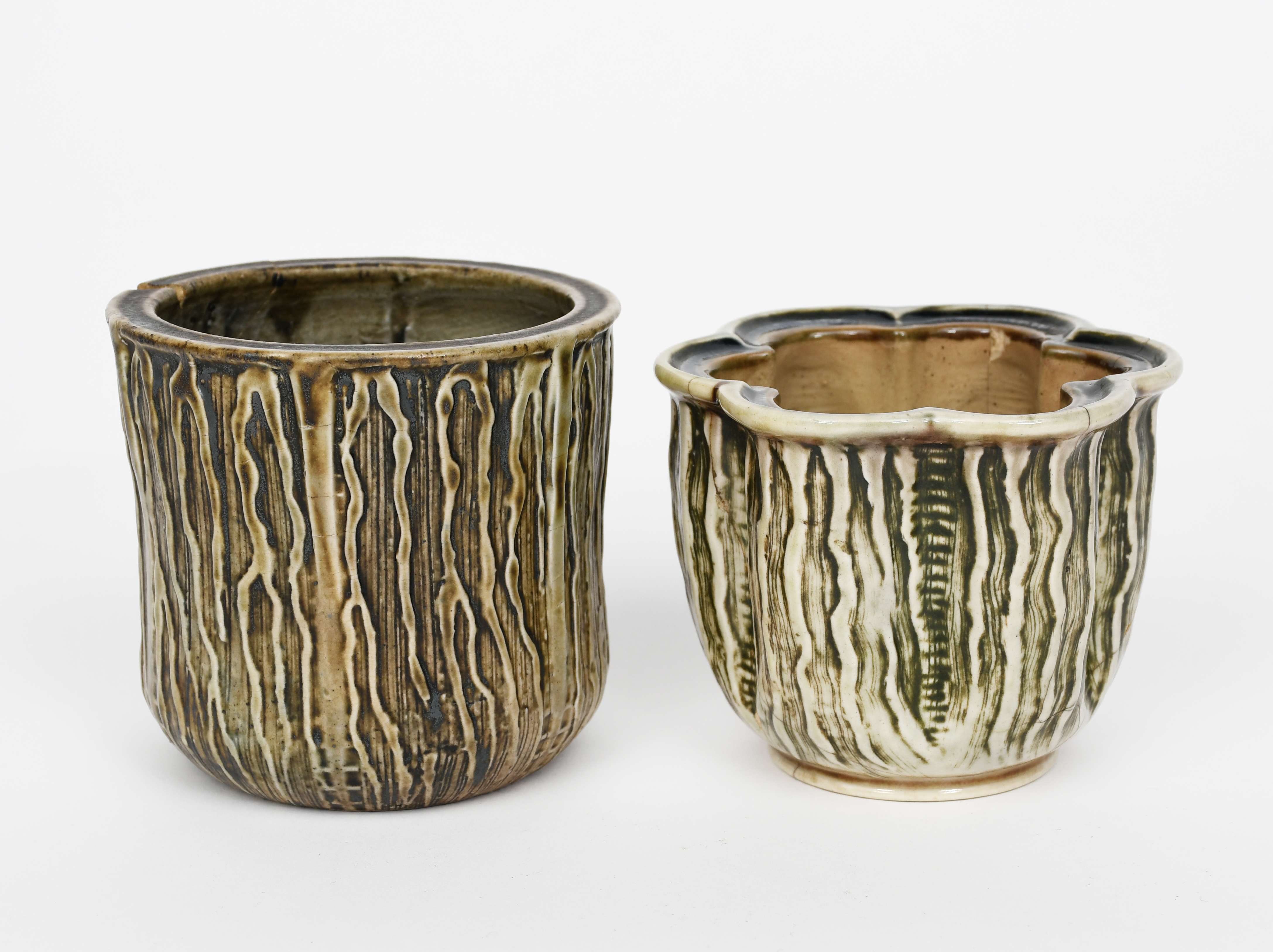 A Martin Brothers stoneware gourd pot by Edwin and Walter Martin, dated 1903, fluted cylindrical form with modelled and incised vertical ribs and veins, glazed green and blue on a buff ground, and another similar dated 1915, incised 5-1903 Martin Bros London & Southall, damages, 9.5cm. high, (2)