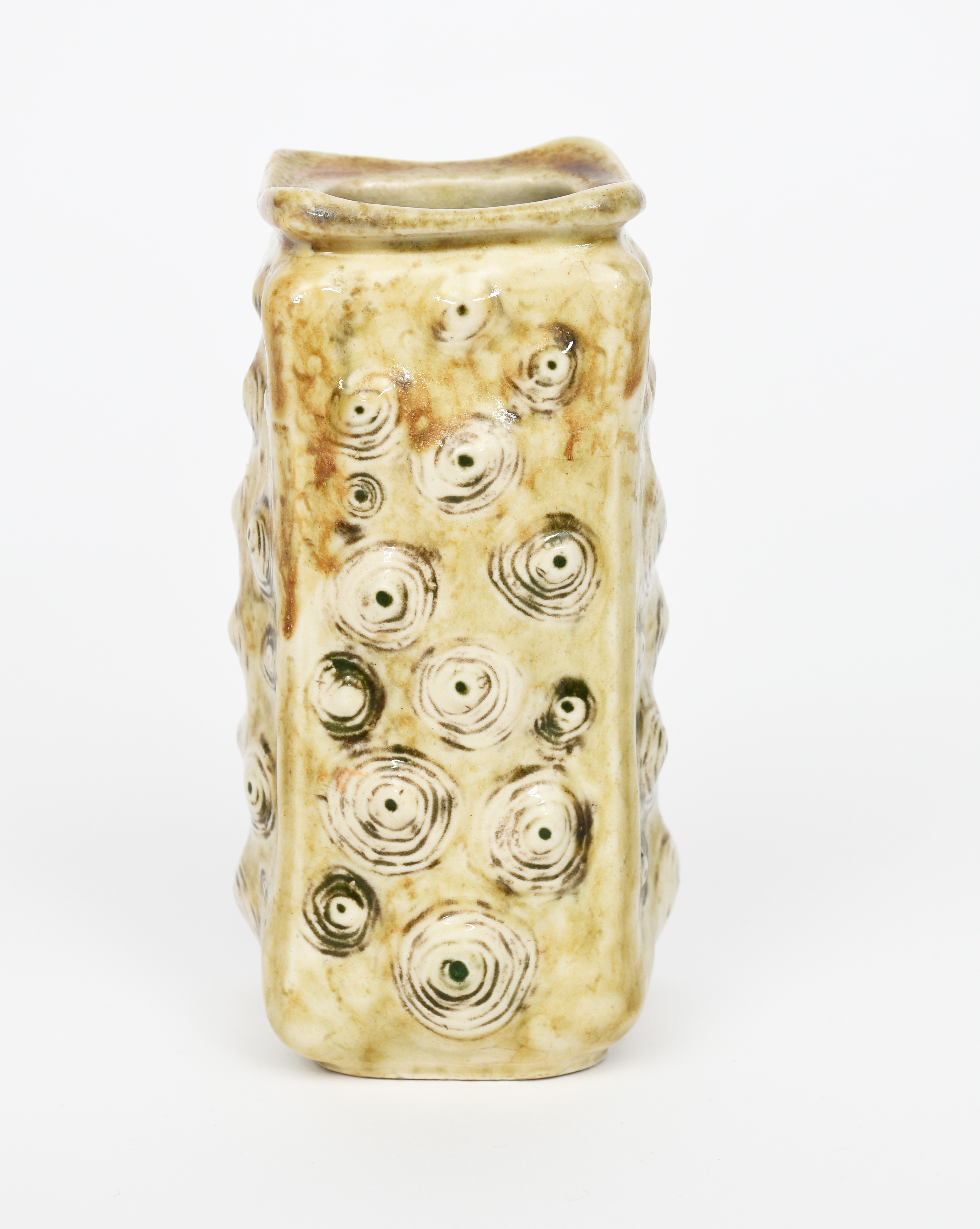 A Martin Brothers stoneware gourd vase by Edwin and Walter Martin, dated 1904, square section, shouldered form, modelled in low relief with limpet motif, glazed in shades of ochre and green on a buff ground, incised 2-1904 Martin Bros London & Southall, minor restoration, 16cm. high