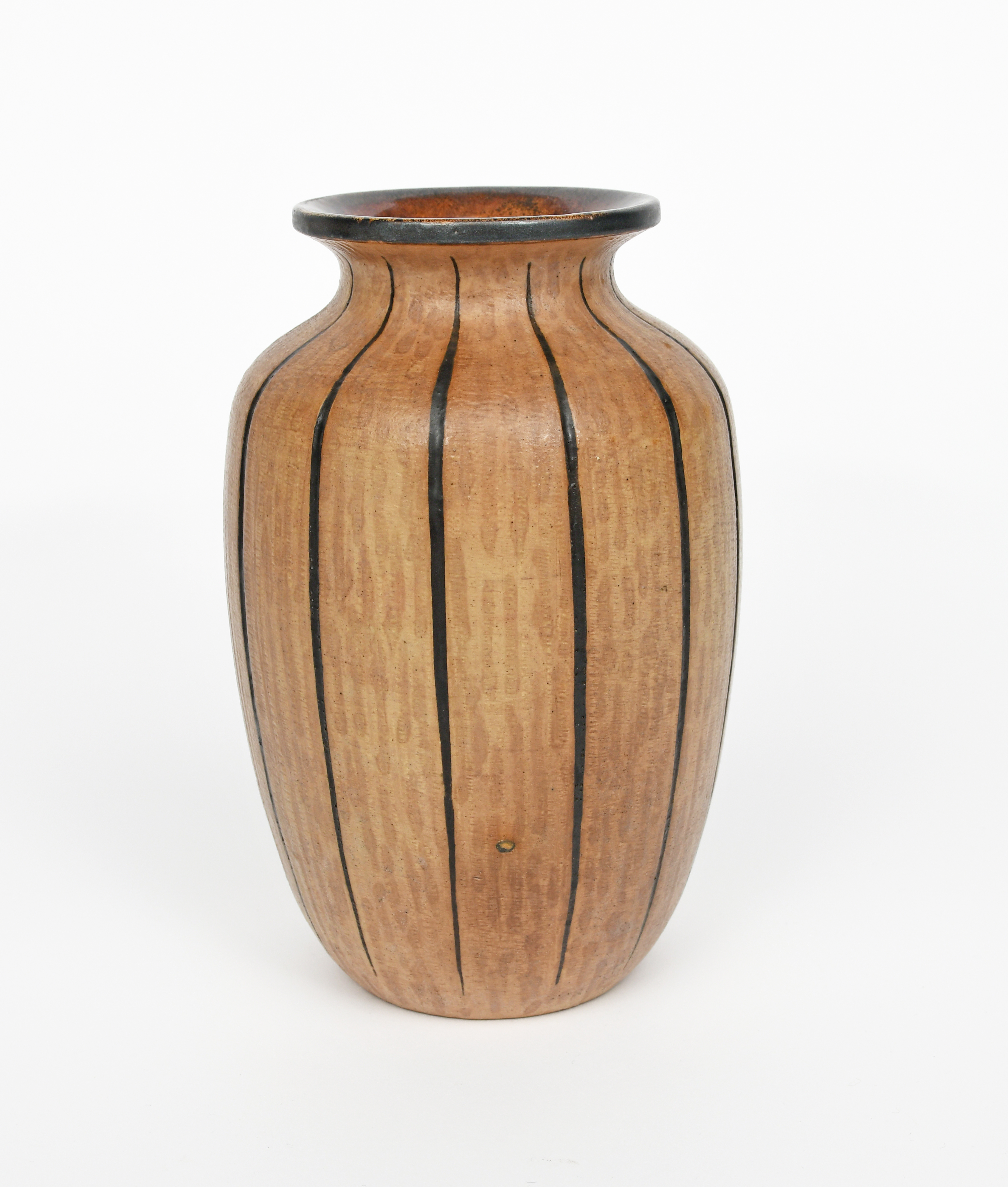 A tall Martin Brothers stoneware gourd vase by Edwin and Walter Martin, dated 1907, shouldered form, incised with vertical ribs, glazed pale brown on tan with dark brown highlights, incised 8-1907 Martin Bros London & Southall, 23cm. high