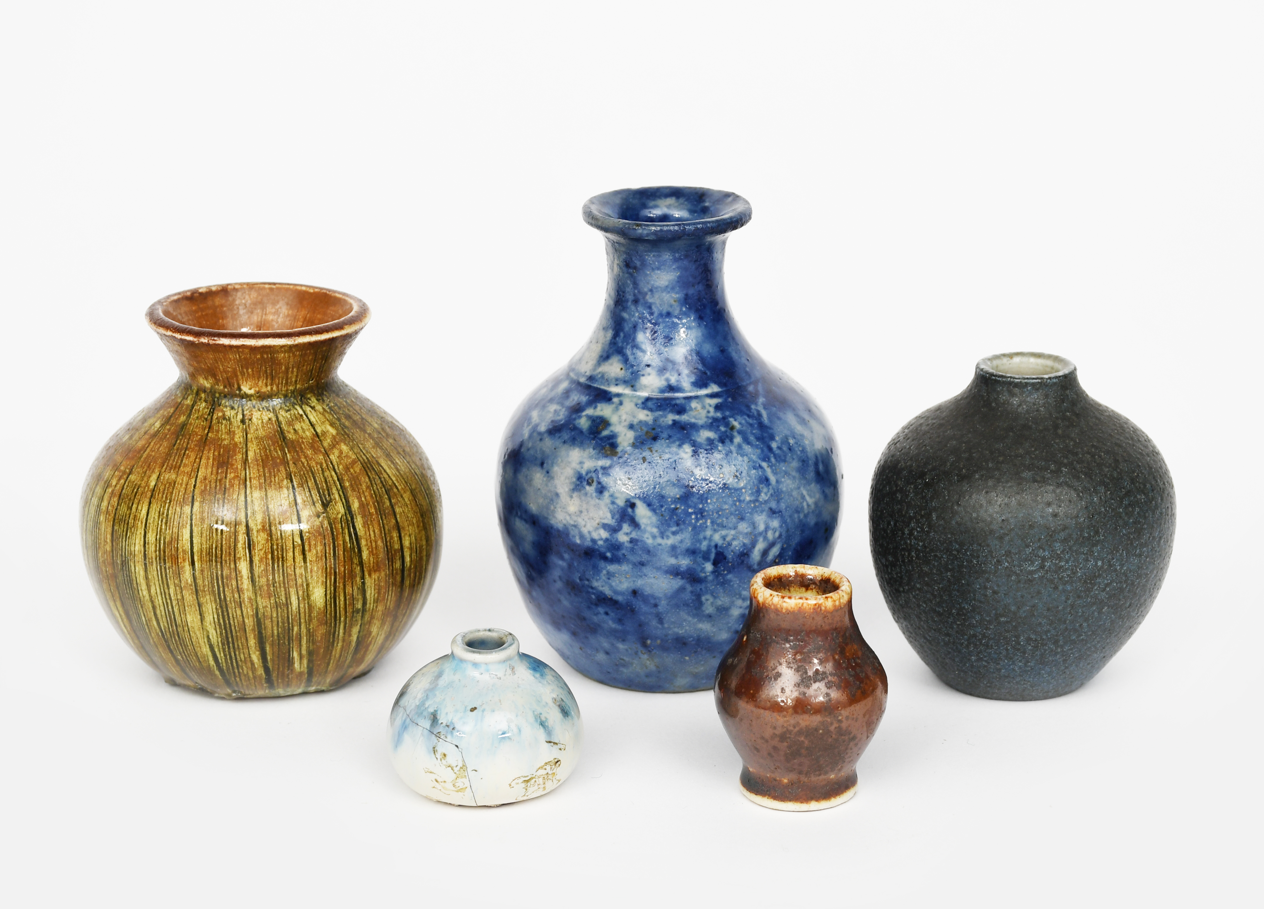 A Martin Brothers stoneware gourd vase by Edwin and Walter Martin, ovoid with everted rim, finely incised with vertical veins, glazed green, brown and yellow, two miniature Martin Brothers vases and two small Martin Brothers vases, incised Martin Bros London & Southall, indistinct date possibly 1-98 to main vase, 7.5cm. high (5)