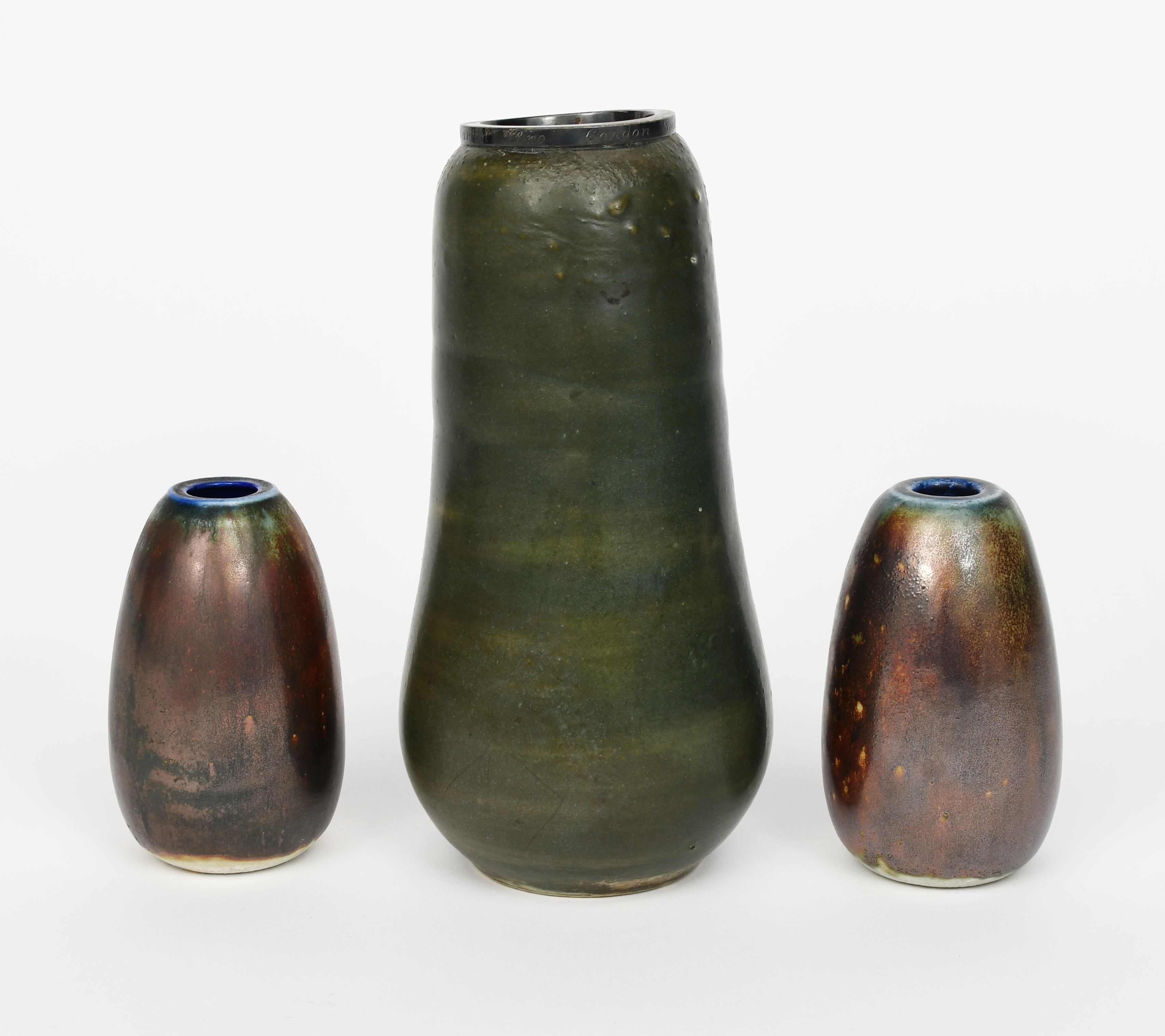 A Martin Brothers stoneware gourd vase by Edwin and Walter Martin, dated 1901, simple gourd form with applied silver rim, covered in a green glaze, the rim incised Martin Bro London & Southall, and two later Martin Brothers stoneware gourd vases, covered in a pitted metallic bronze glaze over blue, incised 5-1901 Martin Bros London & Southall, 24cm. high, (3)