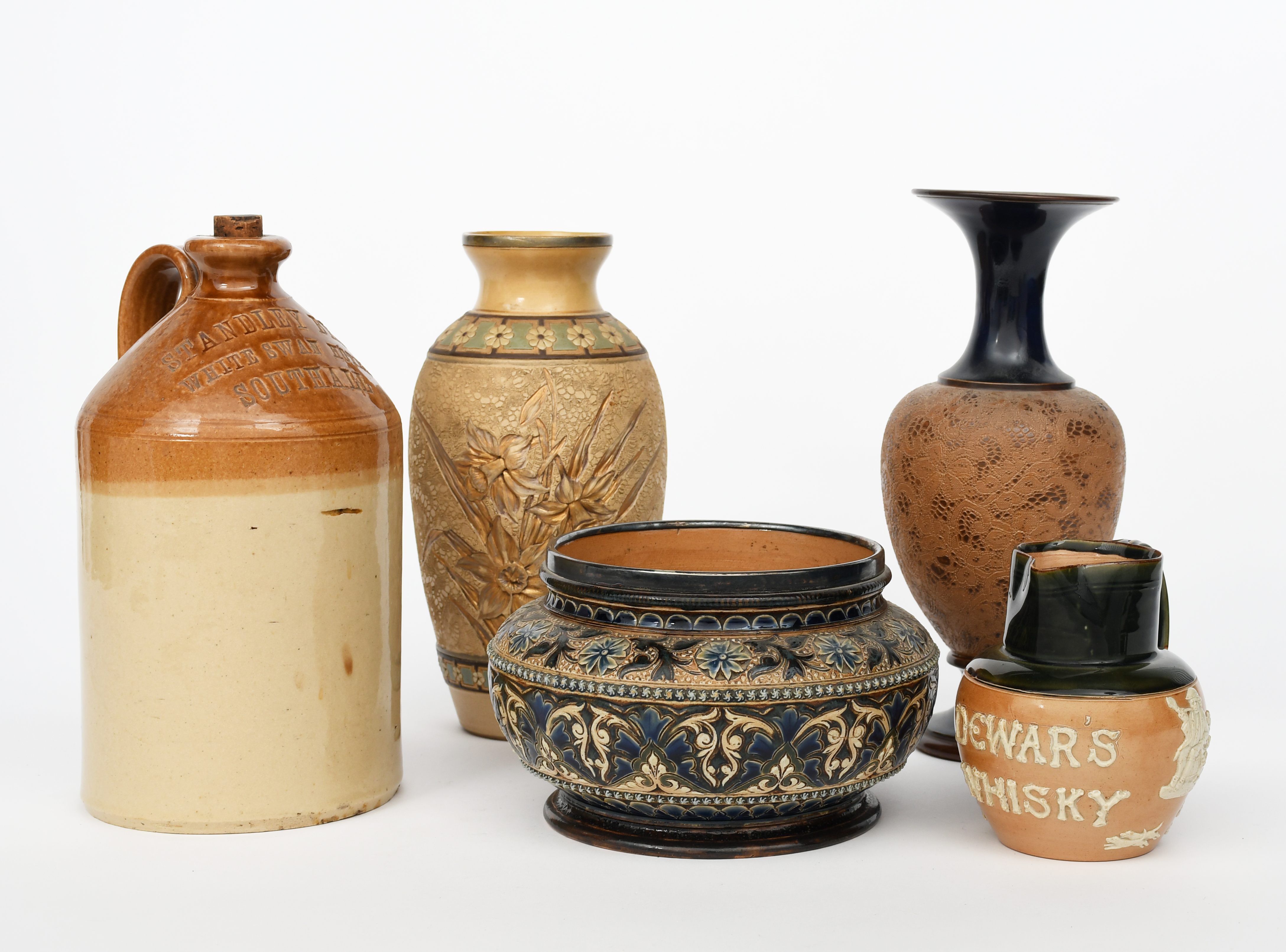 A Doulton Lambeth Silicon Ware vase by Eliza Simmance, Emily Robinson and Kate Hughes, shouldered form, incised and modelled with daffodils, between stylised bands of flowerhead motif, glazed in shades of blue, white and brown, highlighted in gilt on a mushroom ground, a Doulton Lambeth stoneware bowl by Francis E Lee and three other items impressed marks, incised monograms, 26.5cm. high, (5)