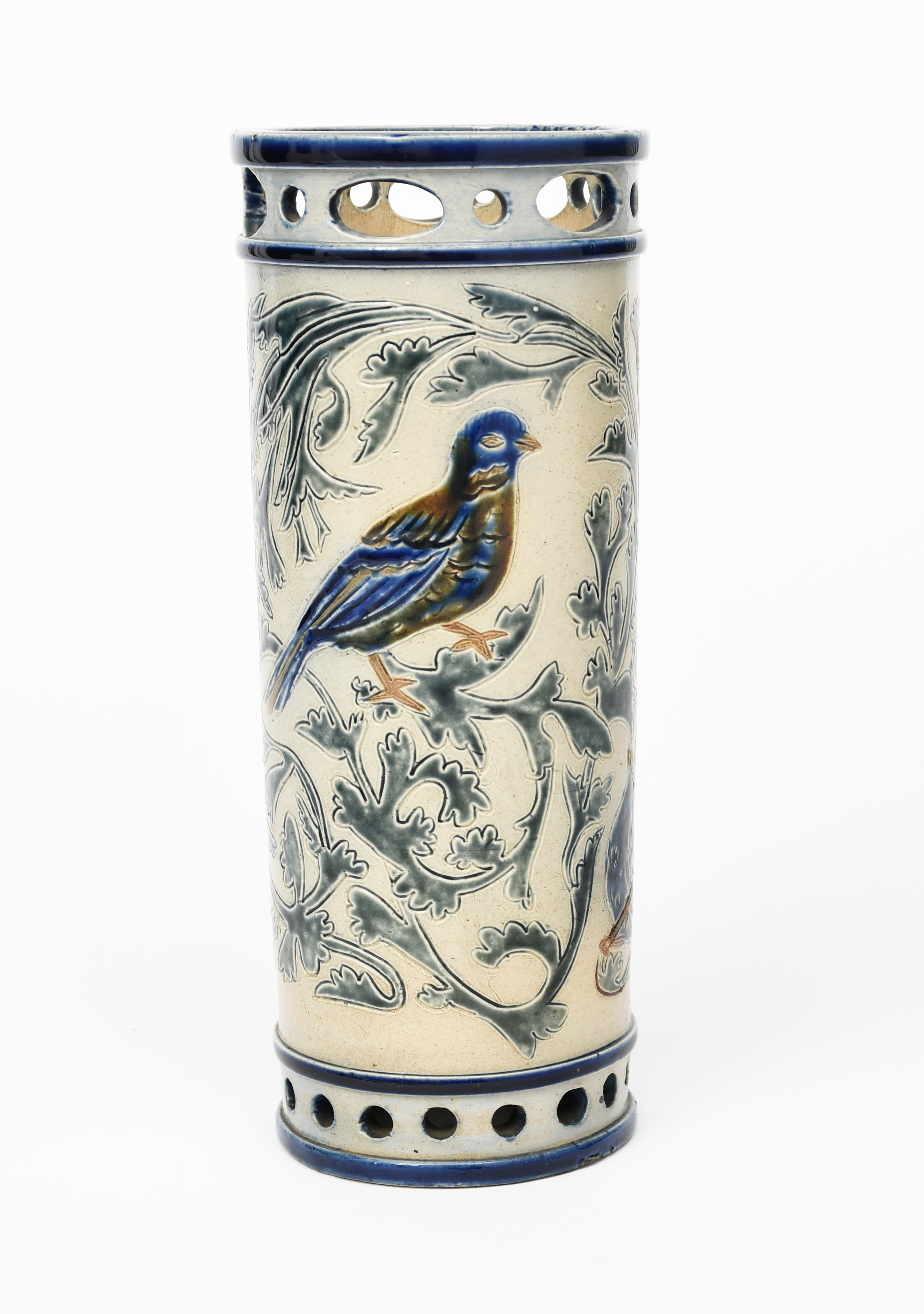 A C.J.C Bailey Fulham stoneware vase by Eric Kettle, cylindrical form with pierced rims, incised and painted with a birds perched in scrolling foliage around a nest with chicks in, glazed blue, green and tan on a buff ground incised C.J.C Bailey, Fulham and EK monogram, 27cm. high