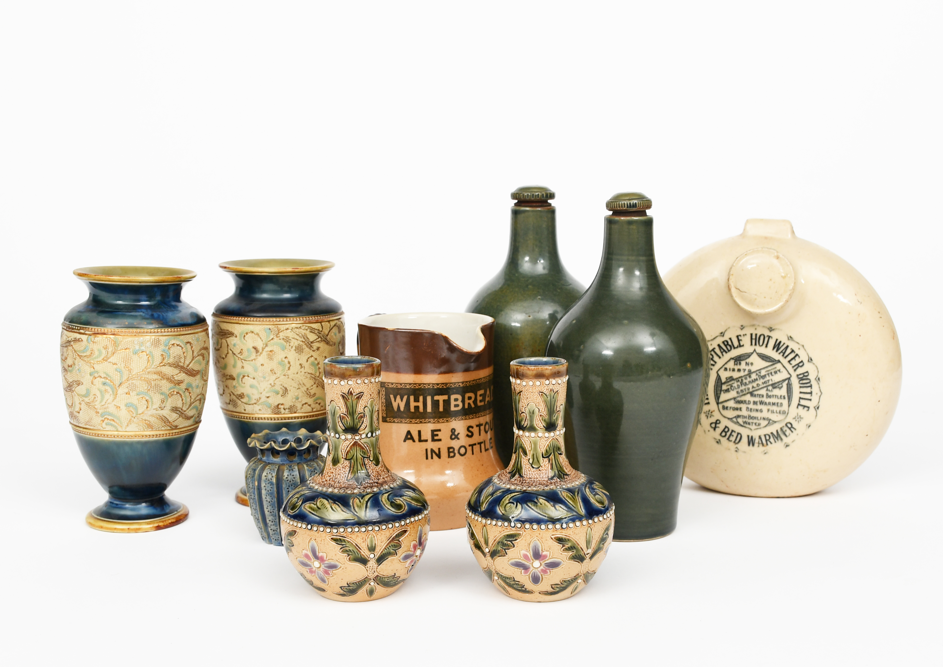 A pair of Fulham Pottery vases, ovoid with cylindrical necks, incised with bands of stylised foliage in green and blue on a buff ground, with white beadwork borders, three Fulham Pottery water bottles, a pair of Royal Doulton Slater's patent vases, another small vase, and a Royal Doulton Whitbreads Ale and Stout advertising water jug, impressed marks incised artist monogram, 14cm. high (9)