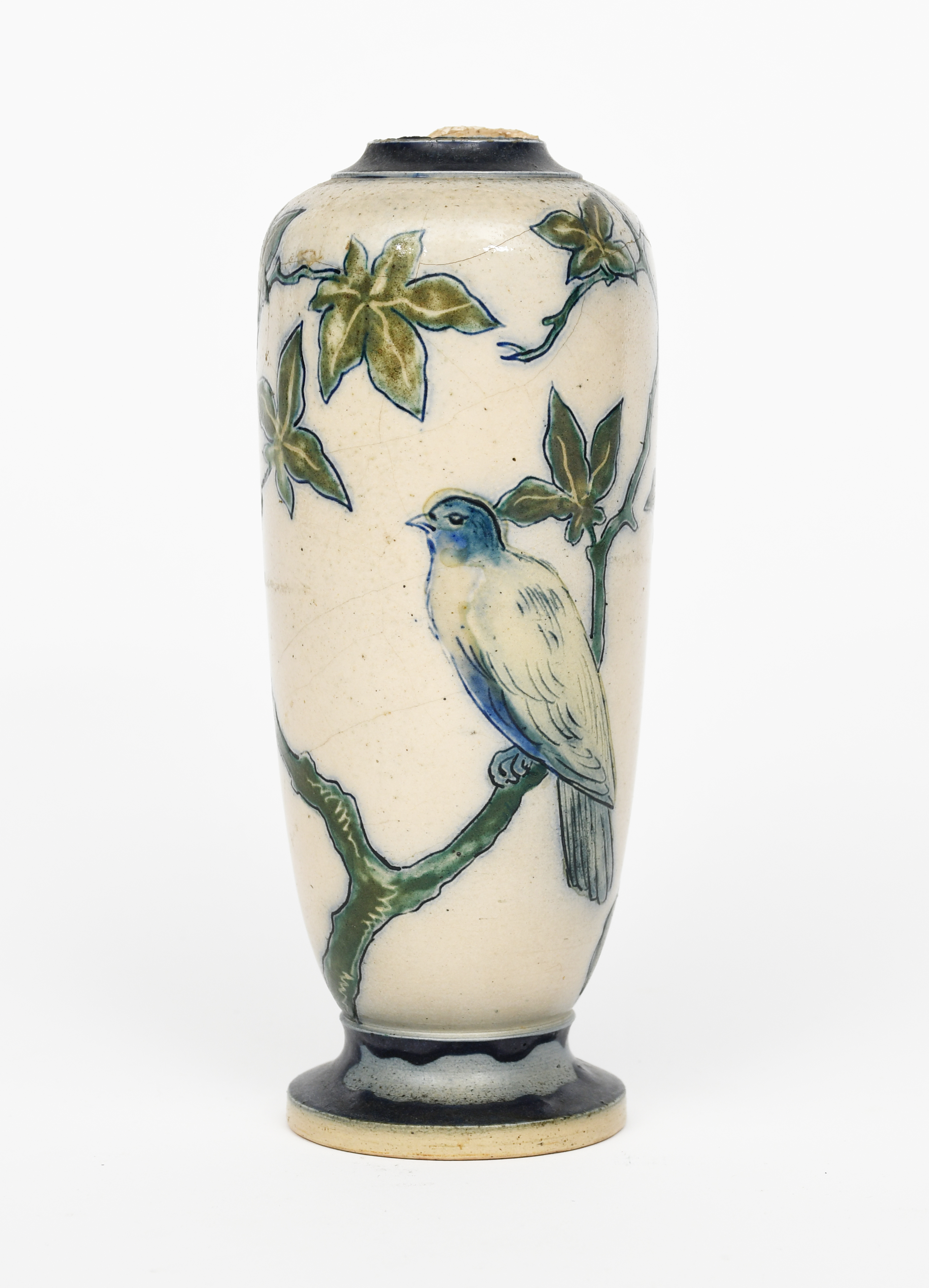 A Martin Brothers stoneware vase by Robert Wallace Martin, dated 1880, slender, shouldered form, incised with a pigeon perched on a tree bough, glazed in shades of blue and green on a buff ground, incised 450, 15-1-80, R W Martin London & Southall, neck off and missing, 18cm. high