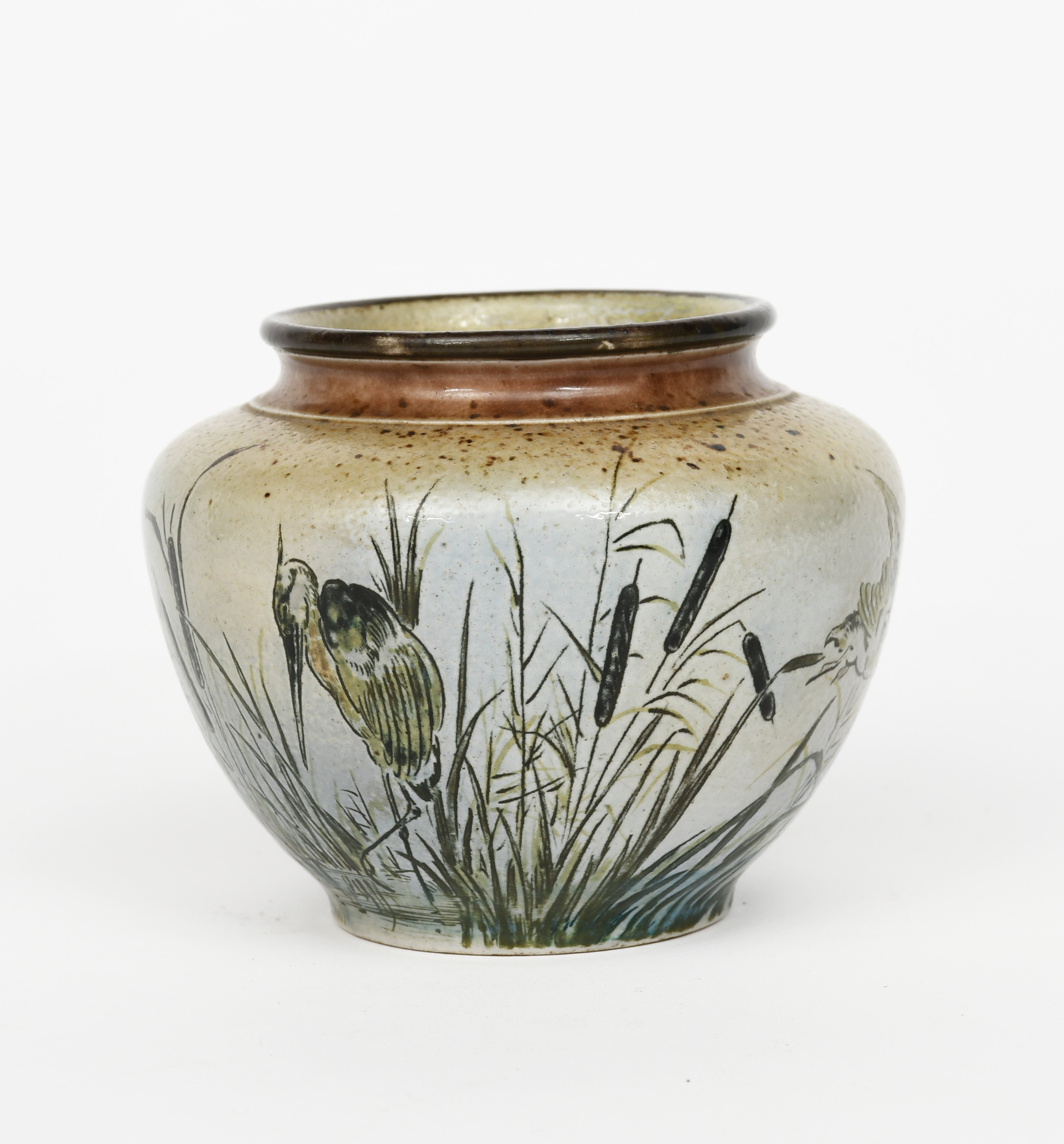 A Martin Brothers stoneware Bird vase by Edwin & Walter Martin, dated 1890, shouldered form, painted with a heron wading amongst bull rushes on a riverbank, a flock of ducks flying above the river, in green and blue on a buff ground, incised 10-1890, Martin Bros London & Southall, museum restored, 9.5cm. high
