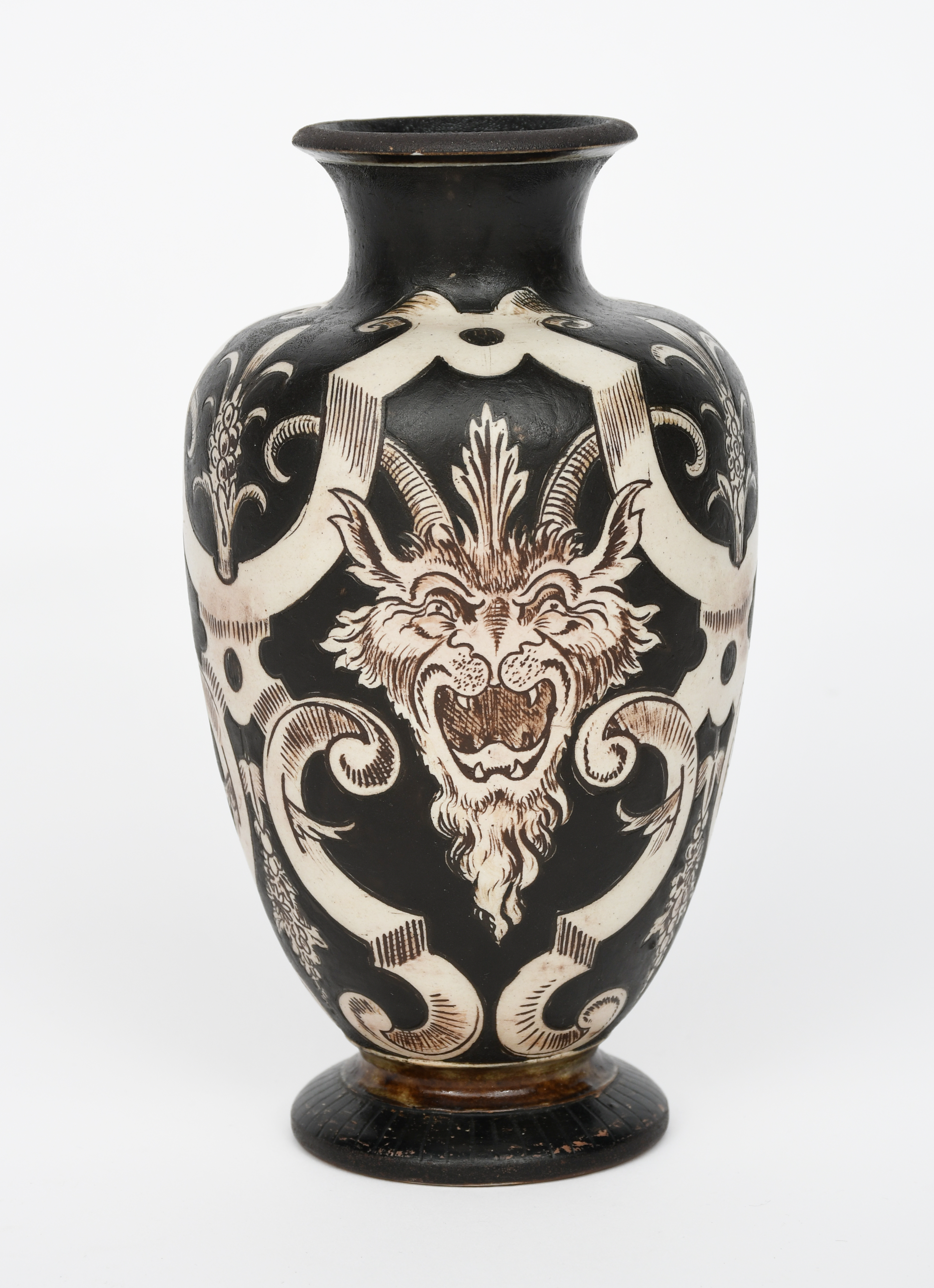 A Martin Brothers stoneware vase by Edwin and Walter Martin, dated 1896, shouldered form, painted with grotesque goat masks inside scrolling trellis, in brown on a buff ground, incised 10-1896 Martin Bros London & Southall, 21cm. high
