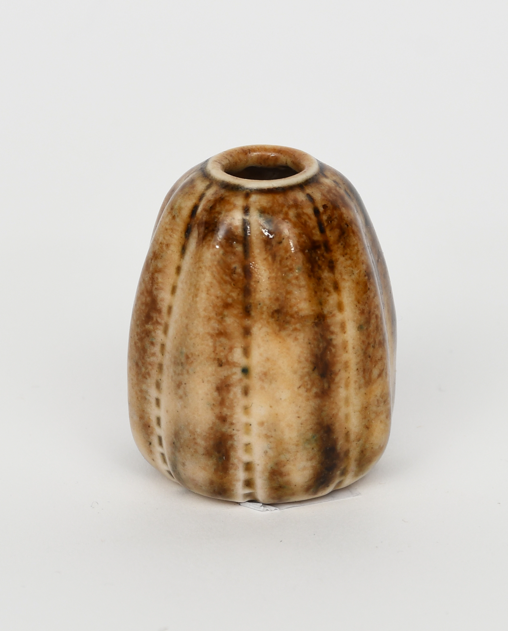 A Martin Brothers stoneware miniature gourd vase by Edwin and Walter Martin, dated 1907, shouldered, ribbed form, covered in a mottled brown glaze, with incised dashes, incised 11-1907 Martin Bros, London & Southall, 4.5cm. high