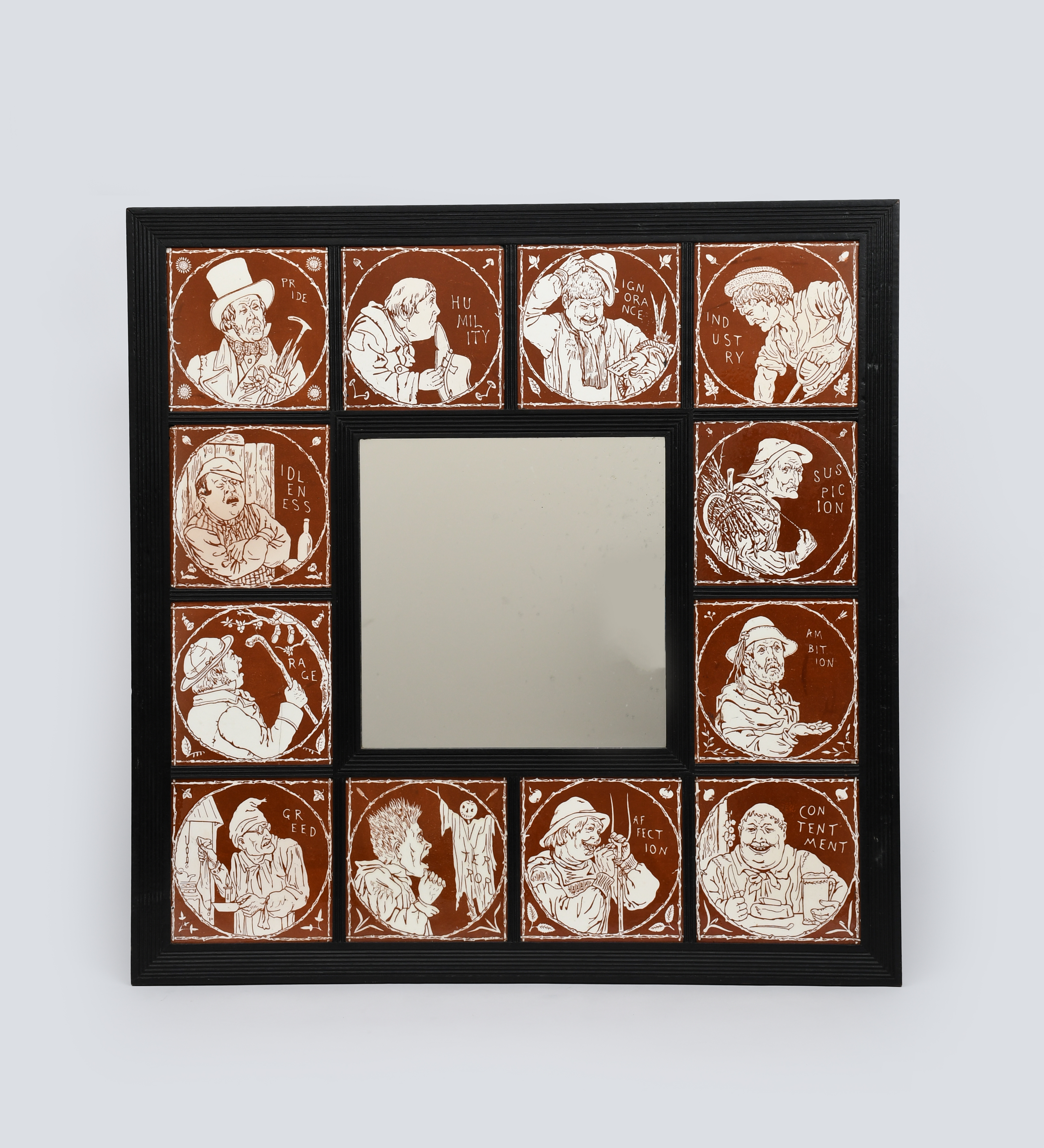 A set of twelve Minton Rustic Humours tiles, printed in brown with character roundels, mounted in ebonised wood mirror frame, comprising pride, humility, ignorance, industry, suspicion, ambition, contentment, affection, terror, greed, rage, and idleness, impressed marks to reverse, 70cm square.